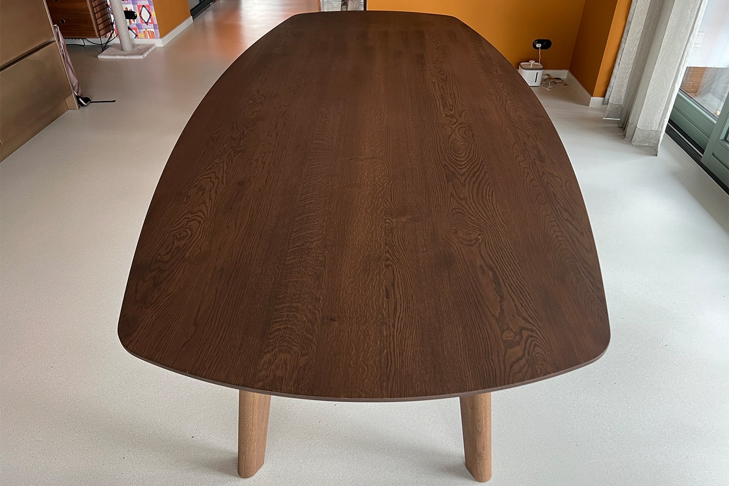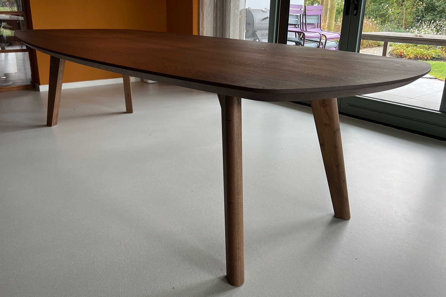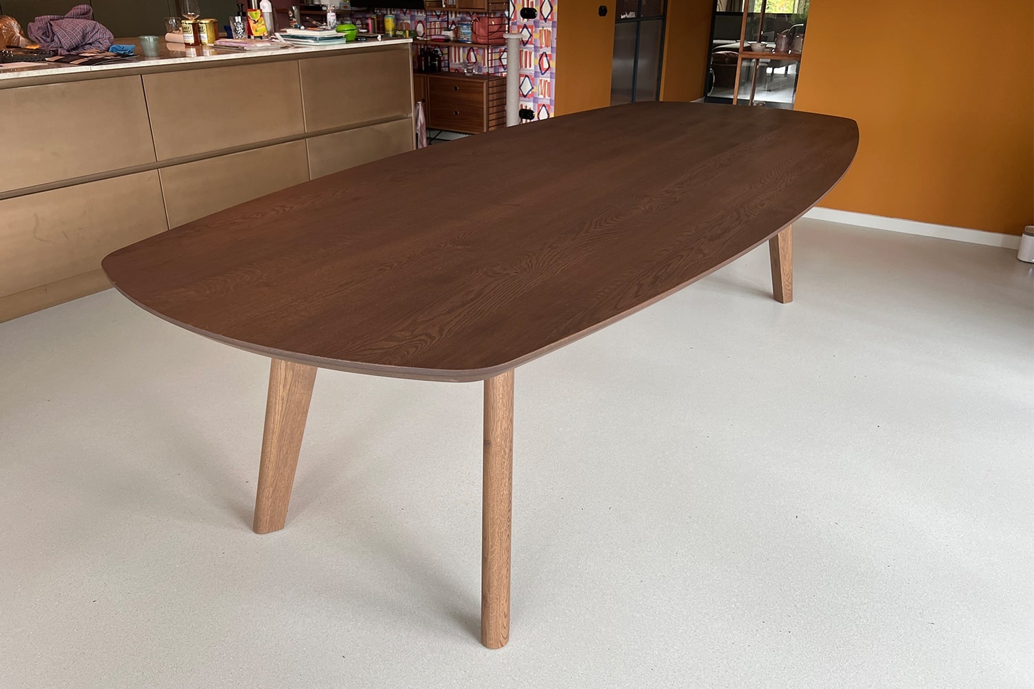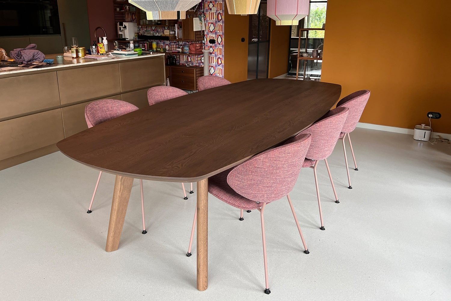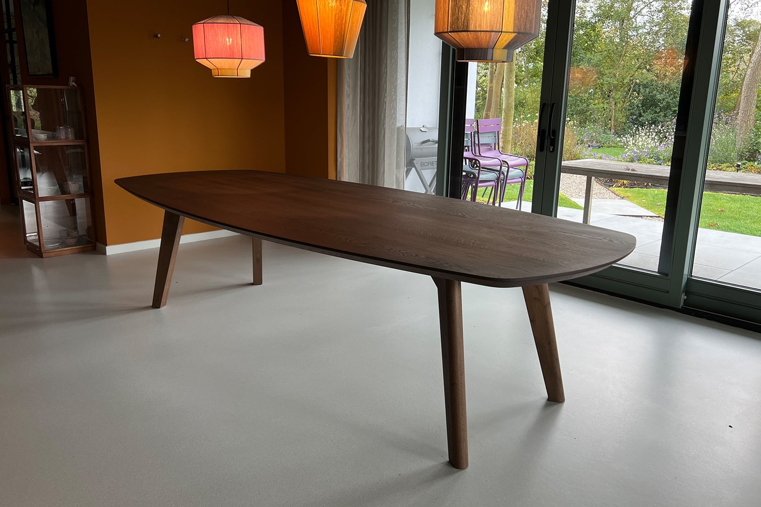 De Navar tafel combineert tijdloze elegantie met natuurlijke warmte door zijn Deense ovale vorm en het gebruik van volmassief Frans eiken met karakteristieke noesten. Het 4 cm dikke tafelblad en de groot facet afgeronde randen geven een stevige en verfijnde uitstraling. Met een walnootkleurige afwerking en royale afmetingen van 300 cm bij 130 cm wordt deze tafel het stralende middelpunt van jouw eetkamer. De schuine eiken poten versterken het klassieke en tegelijk moderne design van deze Deens ovale tafel.