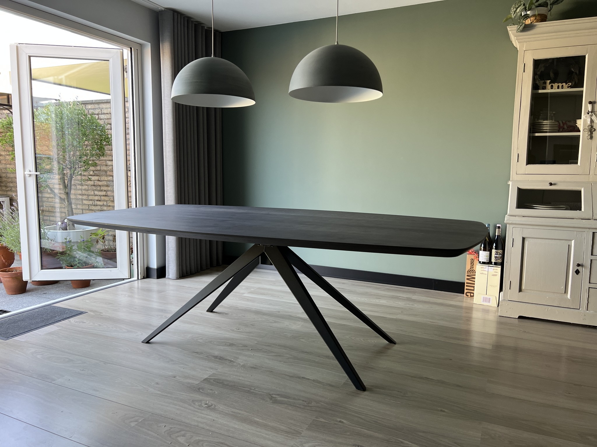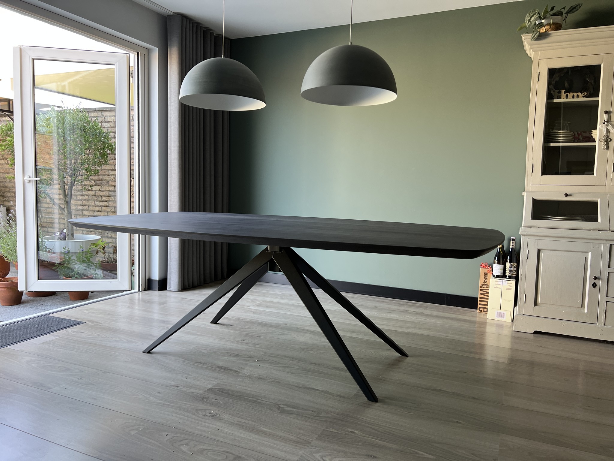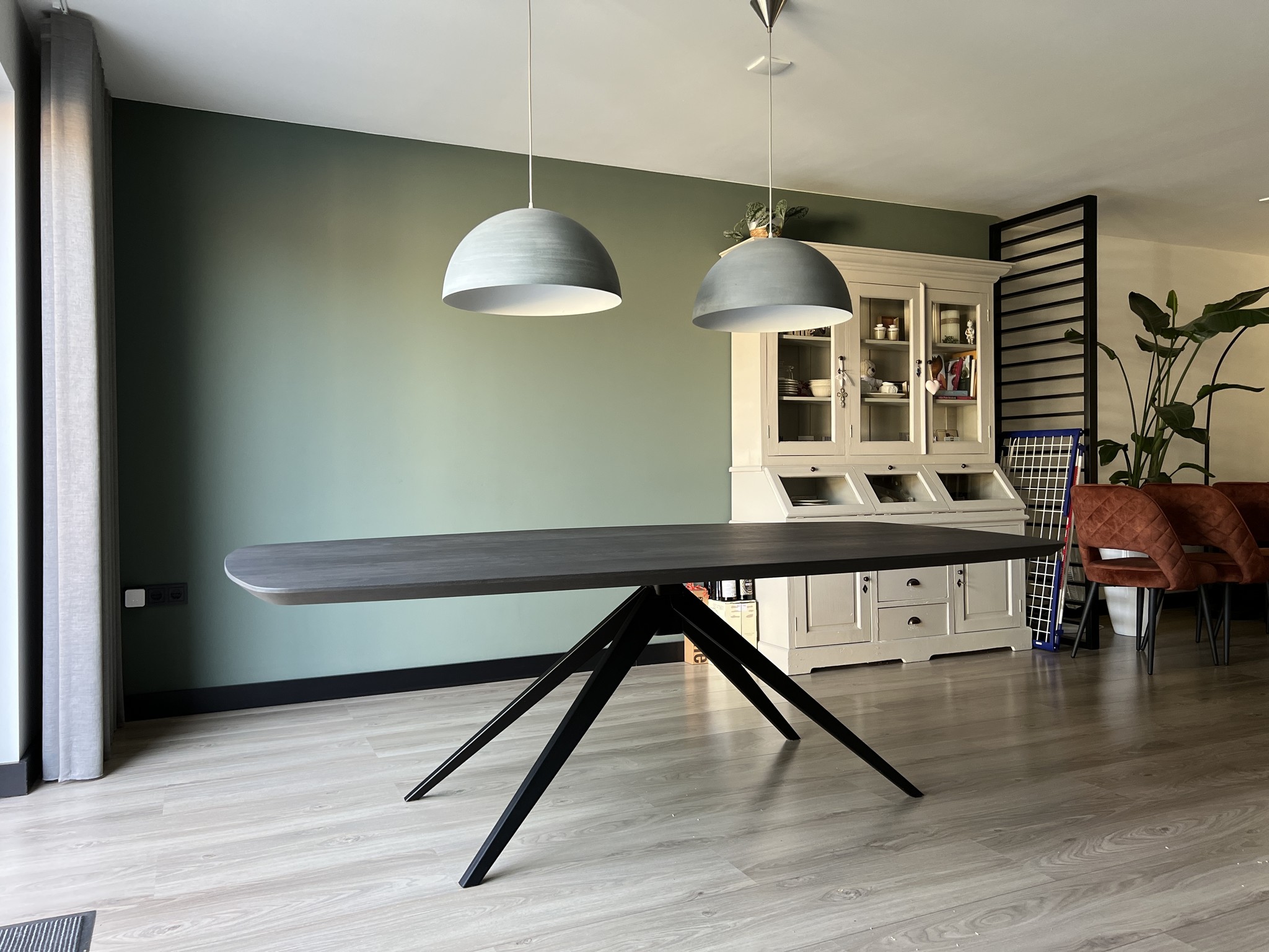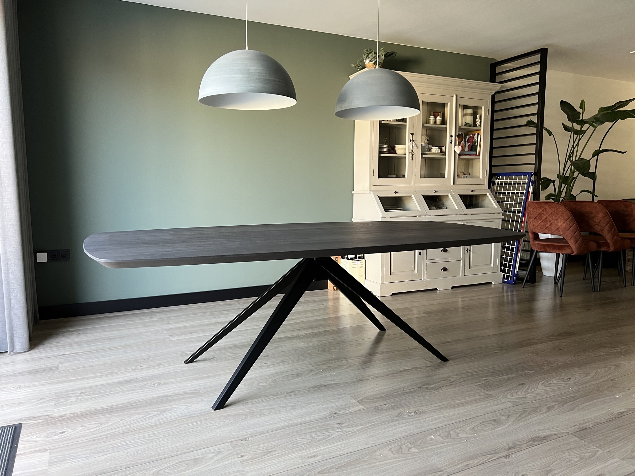 De Merin tafel combineert een strakke Deense ovale vorm met het heldere karakter van foutloos Frans eiken, waardoor hij een rustige en verfijnde uitstraling heeft. Het 2 cm dikke tafelblad met opgedikte 4 cm rand en groot facet is afgewerkt in een dubbele laag Leem, wat zorgt voor een warme, natuurlijke tint. Met afmetingen van 240 cm bij 120 cm biedt de Deense eettafel voldoende ruimte voor gezellige diners en lange gesprekken. De Scandinavische spinpoot geeft het geheel een lichte en moderne uitstraling, die perfect aansluit bij een eigentijds interieur.