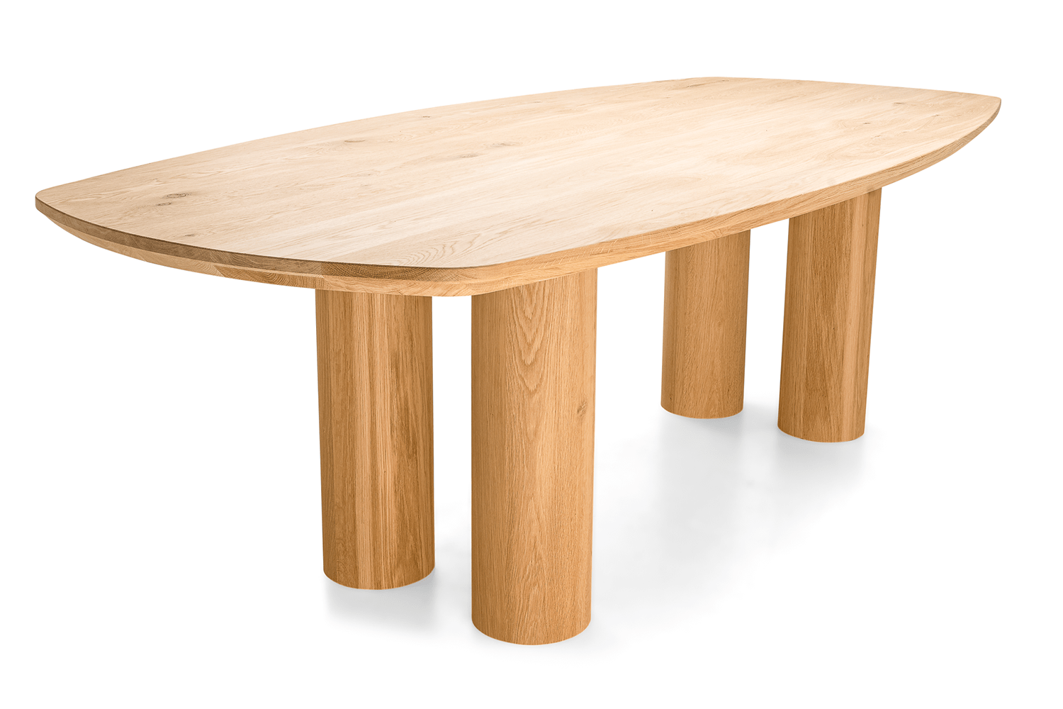 De Velia eettafel combineert een klassieke Deense ovale vorm met de warme uitstraling van normaal Frans eiken met natuurlijke noesten. Het 2 cm dikke tafelblad met opgedikte 4 cm rand en normaal facet geeft een subtiele robuustheid, terwijl de SKYLT-kleur het hout een frisse, natuurlijke tint geeft. Met afmetingen van 240 cm bij 120 cm is er voldoende ruimte voor diners en gezellige momenten van samenzijn. De stevige eiken kolompoten zorgen voor een tijdloos en stabiel design dat elegantie en functionaliteit perfect combineert.