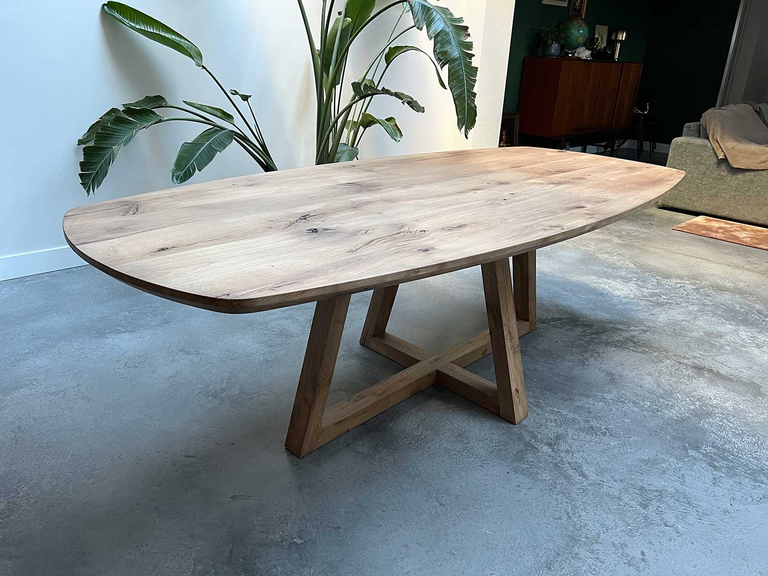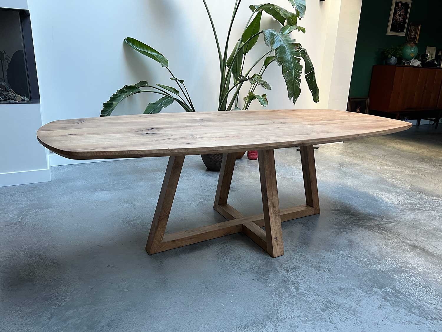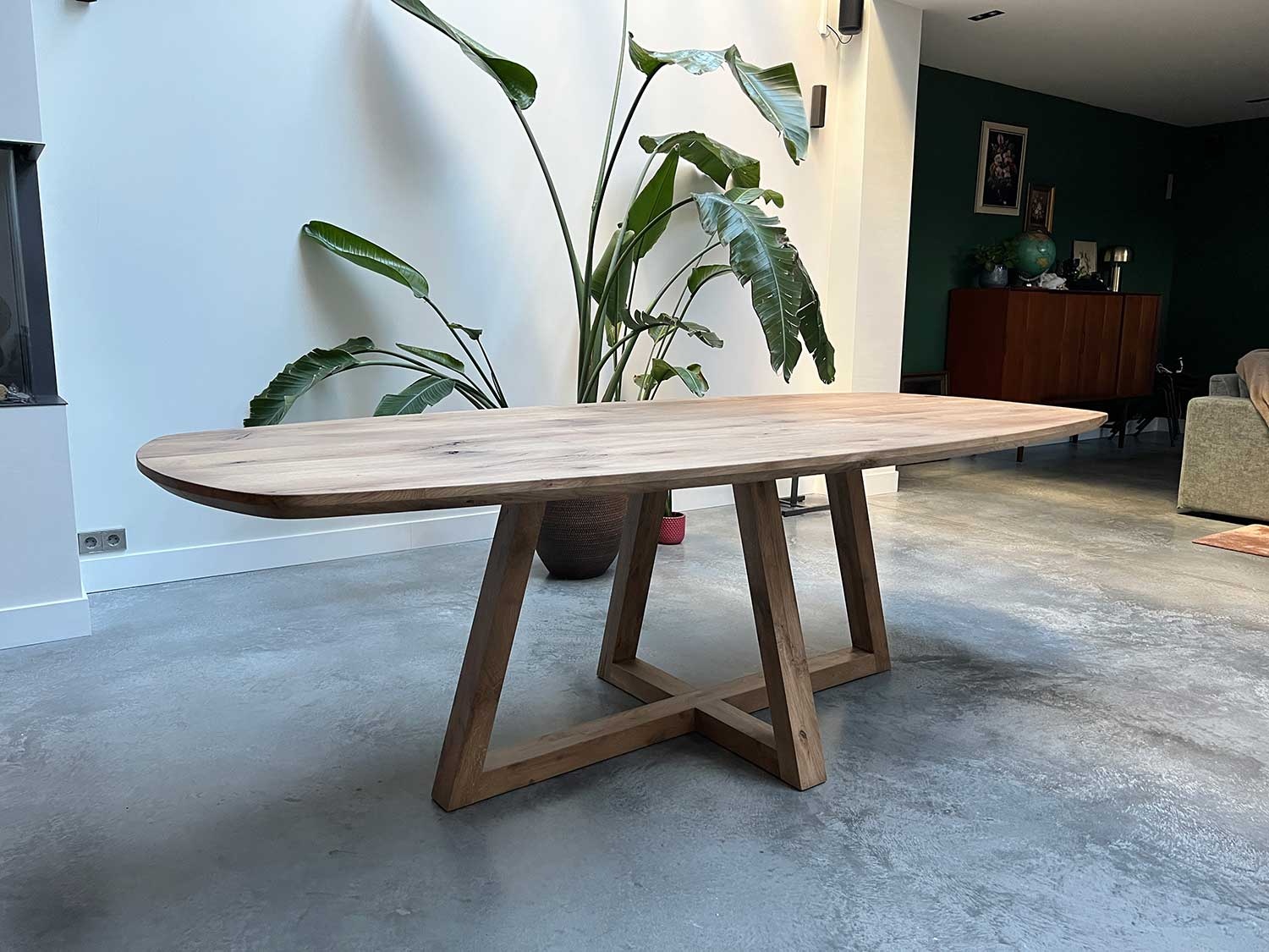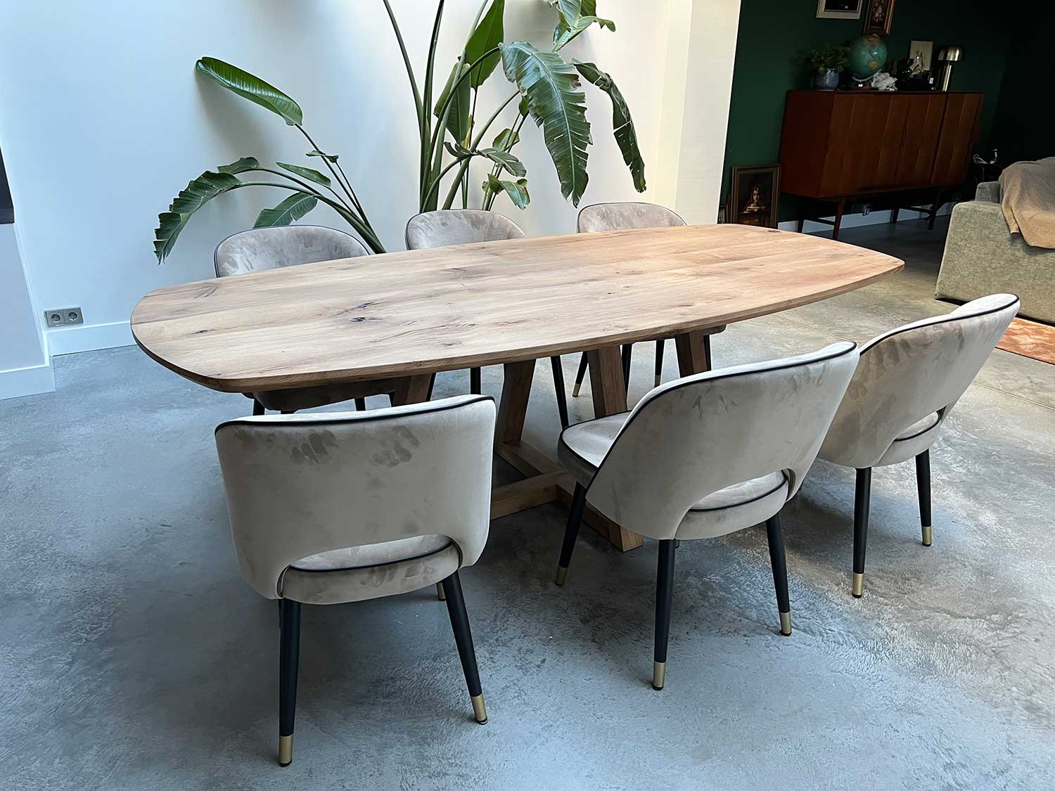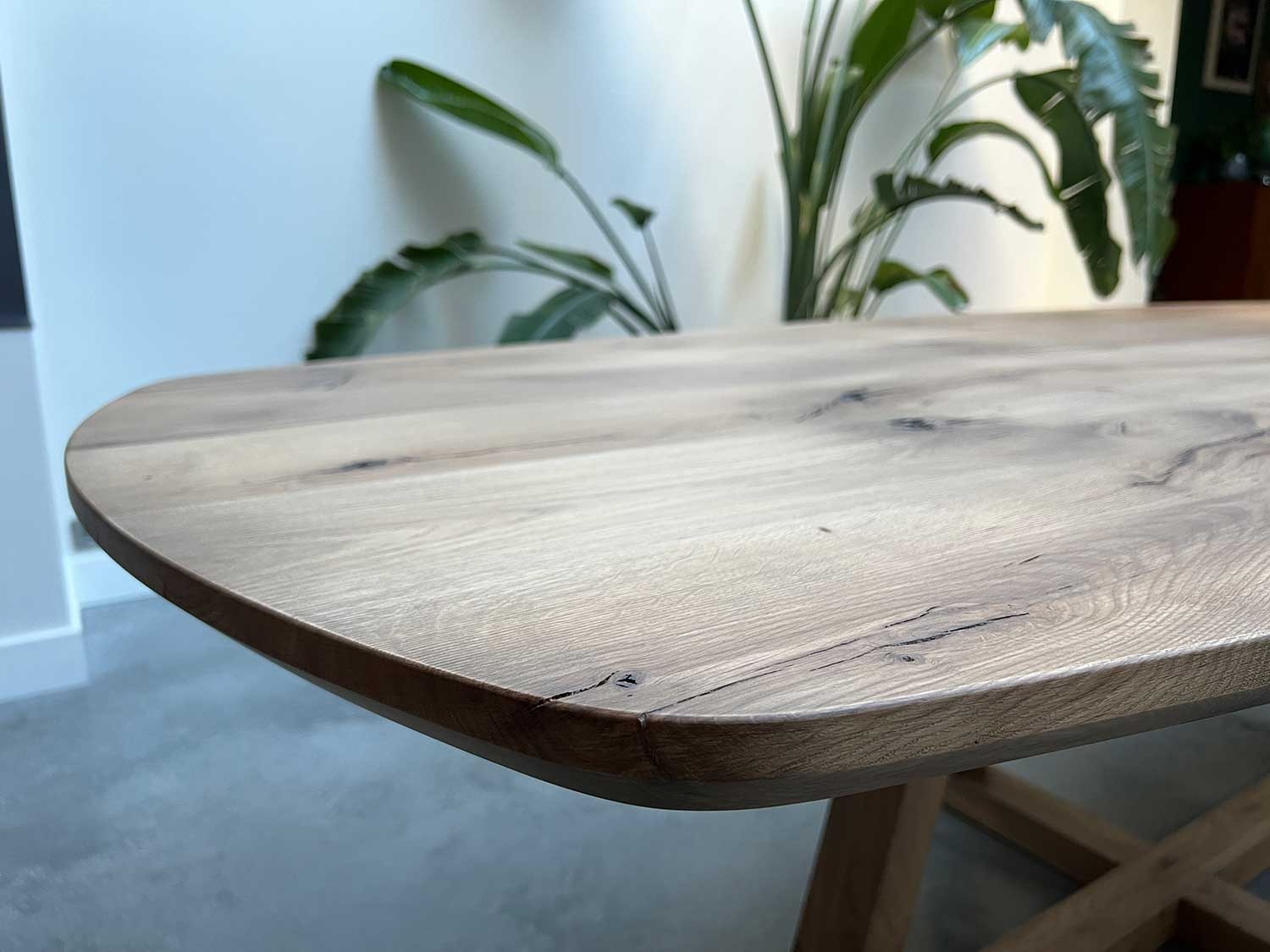 De Elden tafel straalt een warme en natuurlijke sfeer uit dankzij het Deens ovale tafelblad van volmassief Frans eiken met karakteristieke noesten. Het 4 cm dikke blad met normaal facet afgeronde randen en een antieke afwerking geeft een robuuste, maar verfijnde uitstraling. Met een lengte van 240 cm en een breedte van 110 cm biedt deze Deens ovale eettafel voldoende ruimte voor elk samenzijn. De langwerpige eiken kruispoten voegen een stoer en tegelijk elegant accent toe aan het geheel.