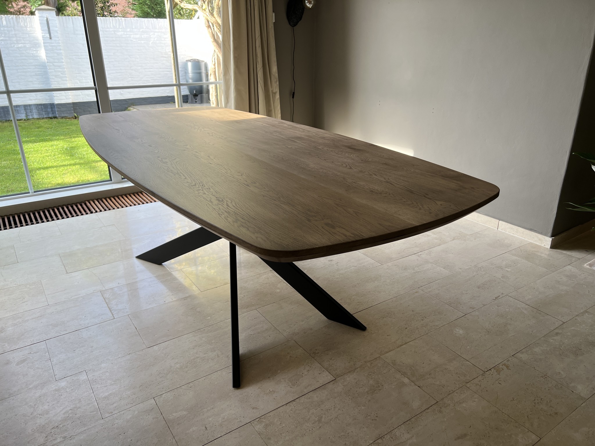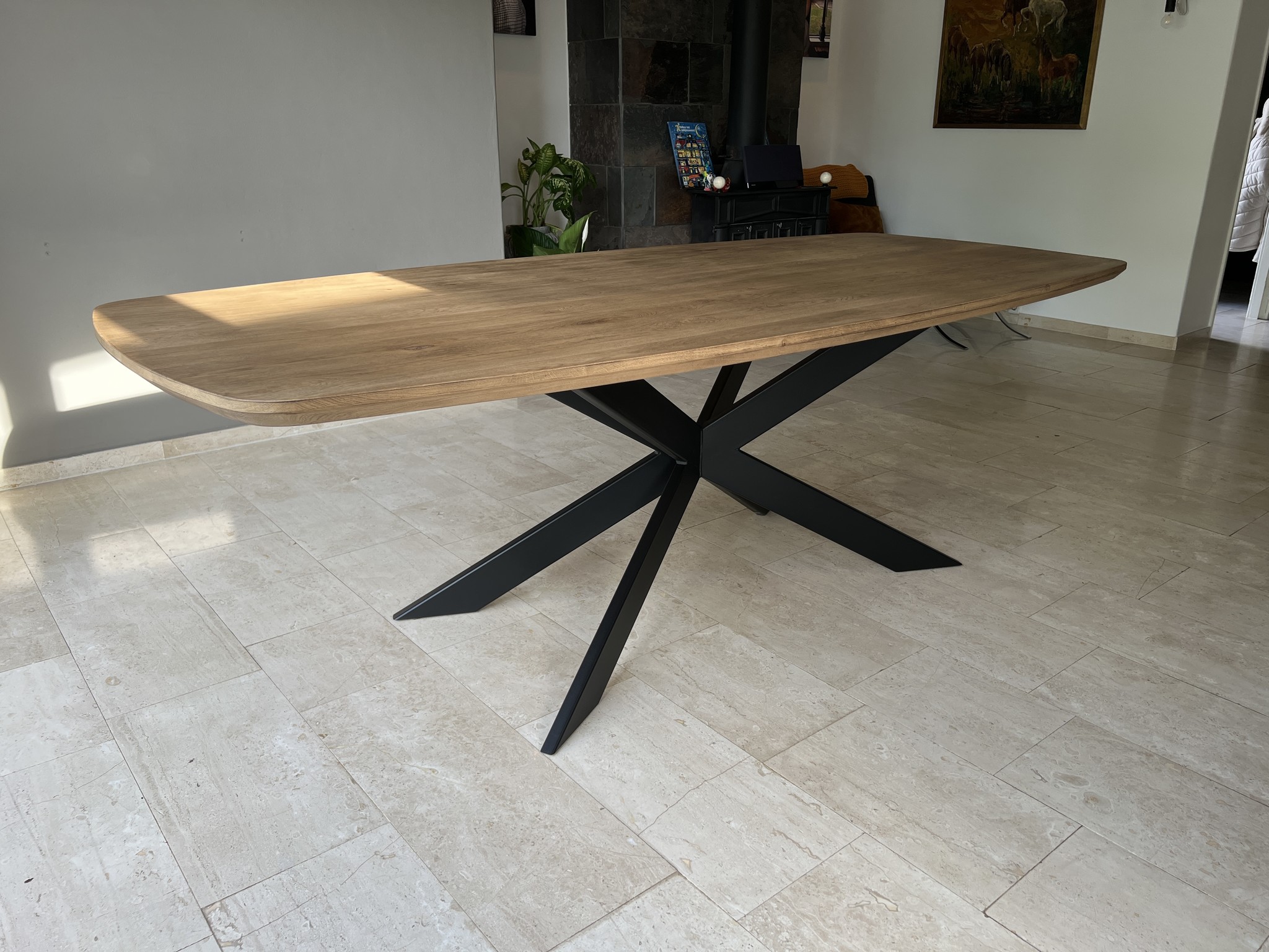 De Zarco tafel is Deens ovaal van vorm en straalt elegantie uit met de natuurlijke charme van Frans eiken met karakteristieke noesten. Het 2 cm dikke tafelblad met opgedikte 4 cm rand en normaal facet geeft de tafel een verfijnde en robuuste uitstraling, terwijl de antieke kleur het hout een warme, authentieke toon geeft. Met afmetingen van 240 cm bij 110 cm biedt deze tafel voldoende ruimte voor diners en gezellige bijeenkomsten. De spinpoot gekruist voegt een speels en modern accent toe dat het geheel een unieke uitstraling geeft.