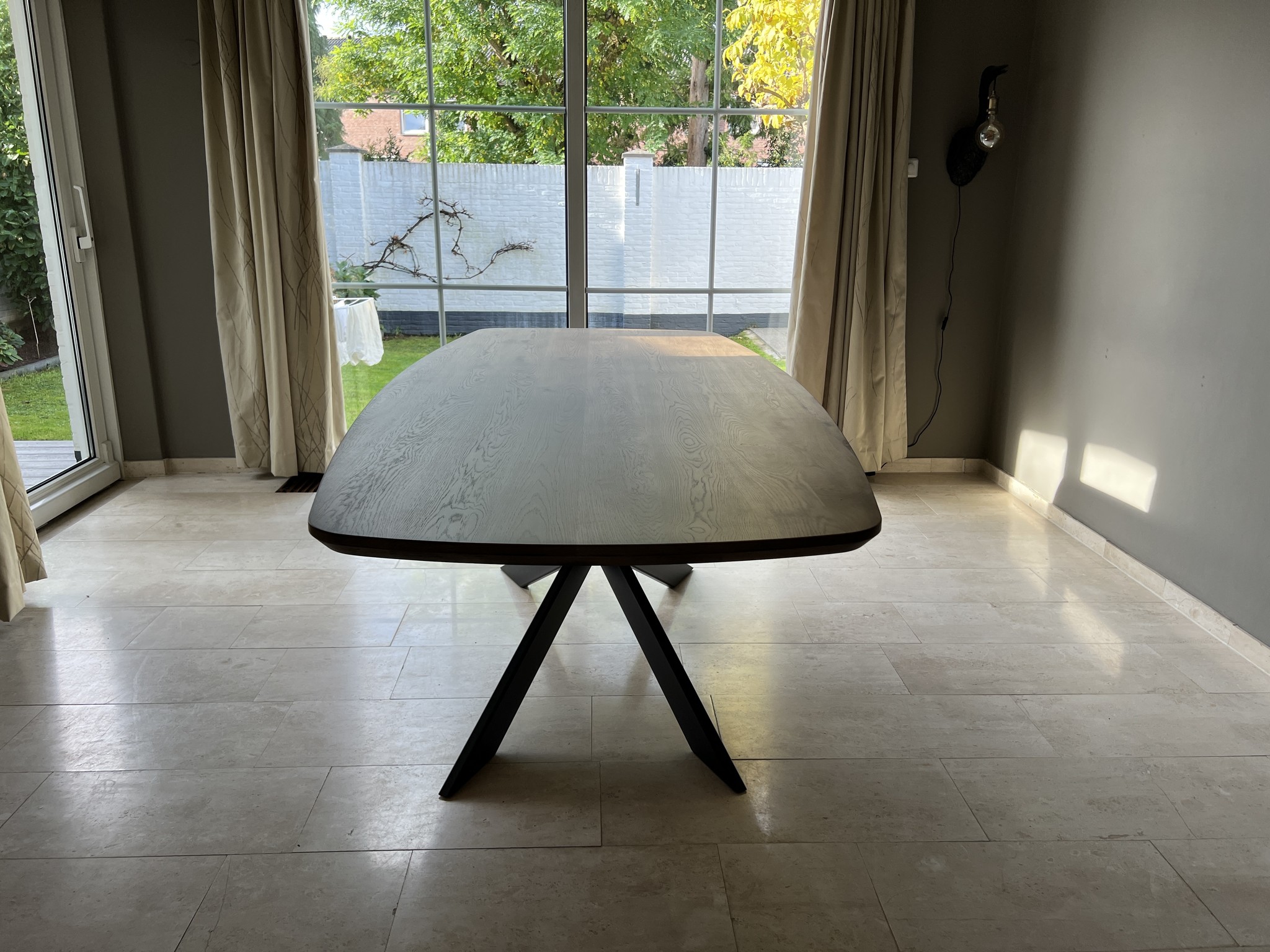 De Zarco tafel is Deens ovaal van vorm en straalt elegantie uit met de natuurlijke charme van Frans eiken met karakteristieke noesten. Het 2 cm dikke tafelblad met opgedikte 4 cm rand en normaal facet geeft de tafel een verfijnde en robuuste uitstraling, terwijl de antieke kleur het hout een warme, authentieke toon geeft. Met afmetingen van 240 cm bij 110 cm biedt deze tafel voldoende ruimte voor diners en gezellige bijeenkomsten. De spinpoot gekruist voegt een speels en modern accent toe dat het geheel een unieke uitstraling geeft.