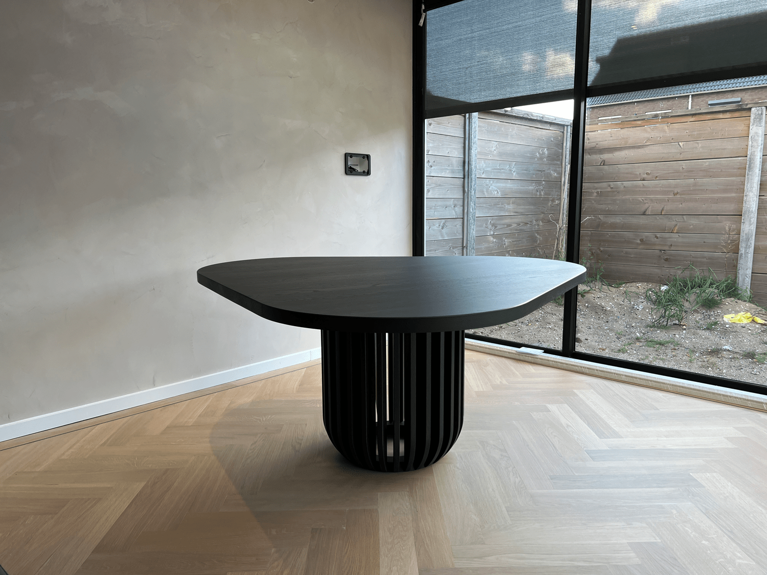 De Luvia eettafel valt op door zijn driehoekige ontwerp dat een speelse en moderne touch aan je interieur geeft. Het volmassieve blad van 4 cm dik, gemaakt van foutloos Frans eiken met weinig tot geen noesten, straalt hoogwaardige kwaliteit uit. De rechte afwerking van de rand en de Dark Oak kleur versterken de elegante uitstraling, terwijl de ronde design tafelpoot het geheel een stijlvol en evenwichtig karakter geeft. Dankzij de perfecte balans tussen vorm en materiaal wordt deze tafel een opvallend middelpunt in je eetruimte.