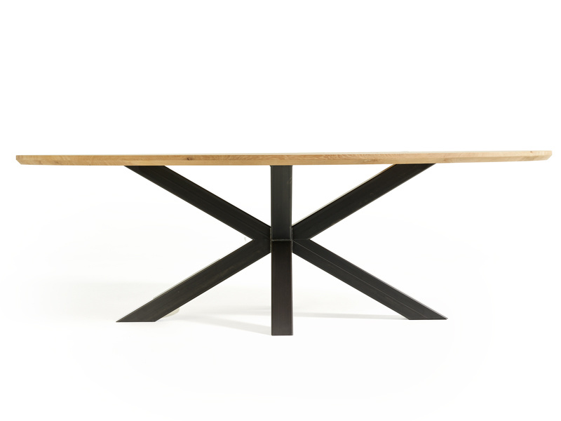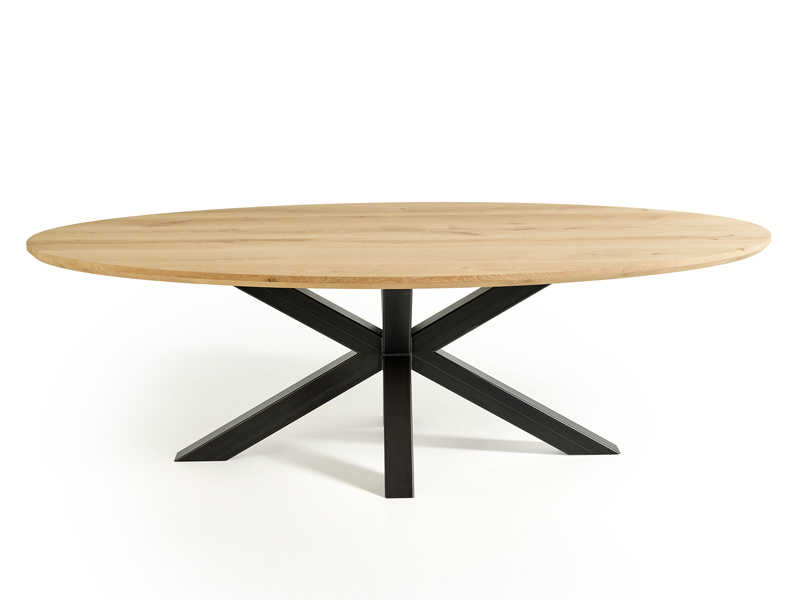 De eettafel Liora valt op door zijn elegante ovale vorm en lichte eikenblad, dat een warme en natuurlijke uitstraling in je interieur brengt. Het volmassieve blad van 2 cm dik, met een opgehoogde rand van 4 cm en subtiele noesten, benadrukt de authentieke uitstraling van Frans eiken. Met een lengte van 240 cm en een breedte van 120 cm biedt de tafel royaal plek voor een gezellige maaltijd of een inspirerende werkplek. De zwarte spinpoten geven de tafel een moderne touch en zorgen voor een fraai contrast met het lichte hout.