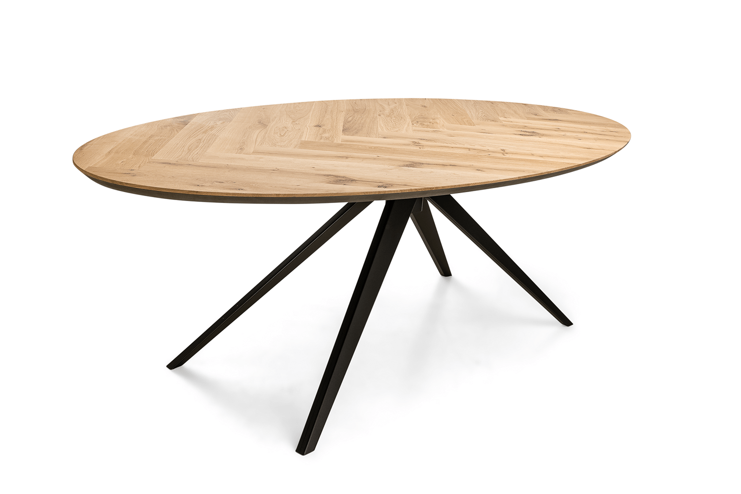 De Bramon ovale visgraat tafel straalt natuurlijke elegantie uit met een prachtig visgraatmotief in Franse eik, afgewerkt in de warme SKYLT houtkleur. Het 33 mm dikke tafelblad ligt op een zwart MDF onderstel dat zorgt voor een fraai contrast en een moderne uitstraling. Met een lengte van 220 cm en een breedte van 110 cm biedt deze tafel voldoende ruimte voor gezellige diners en bijeenkomsten. De Scandinavische spinpoot in zwart geeft het geheel een strakke en eigentijdse basis.