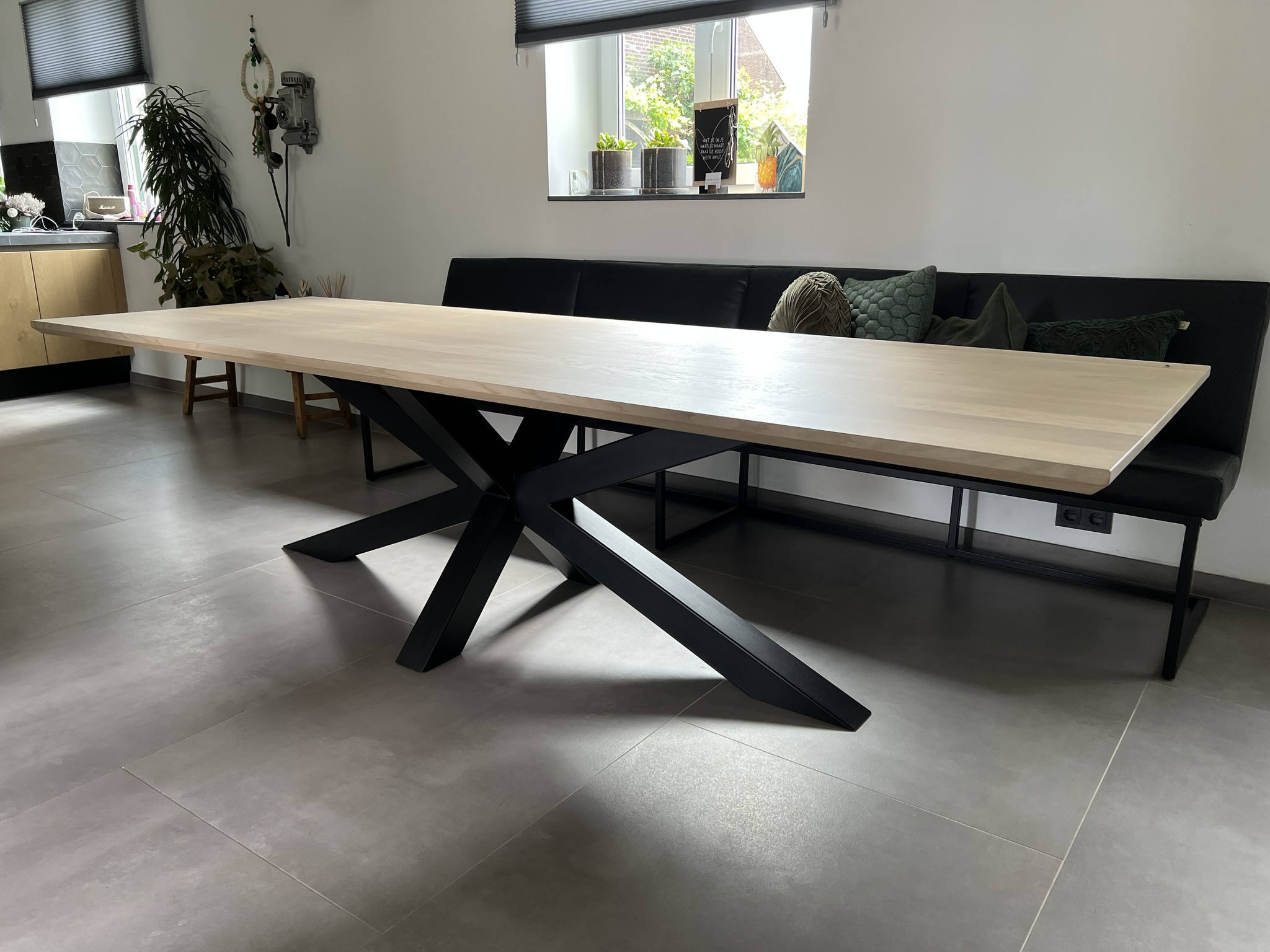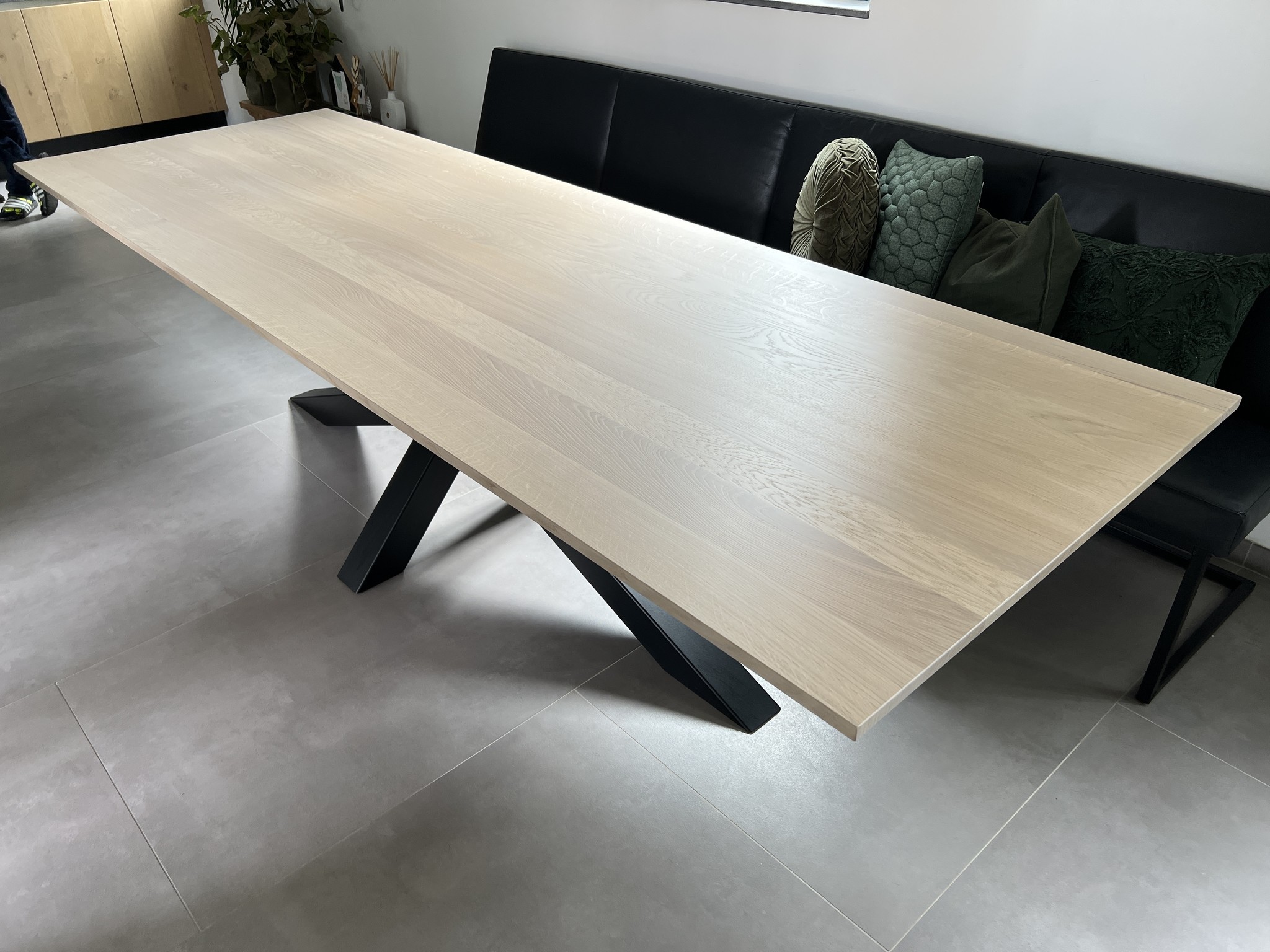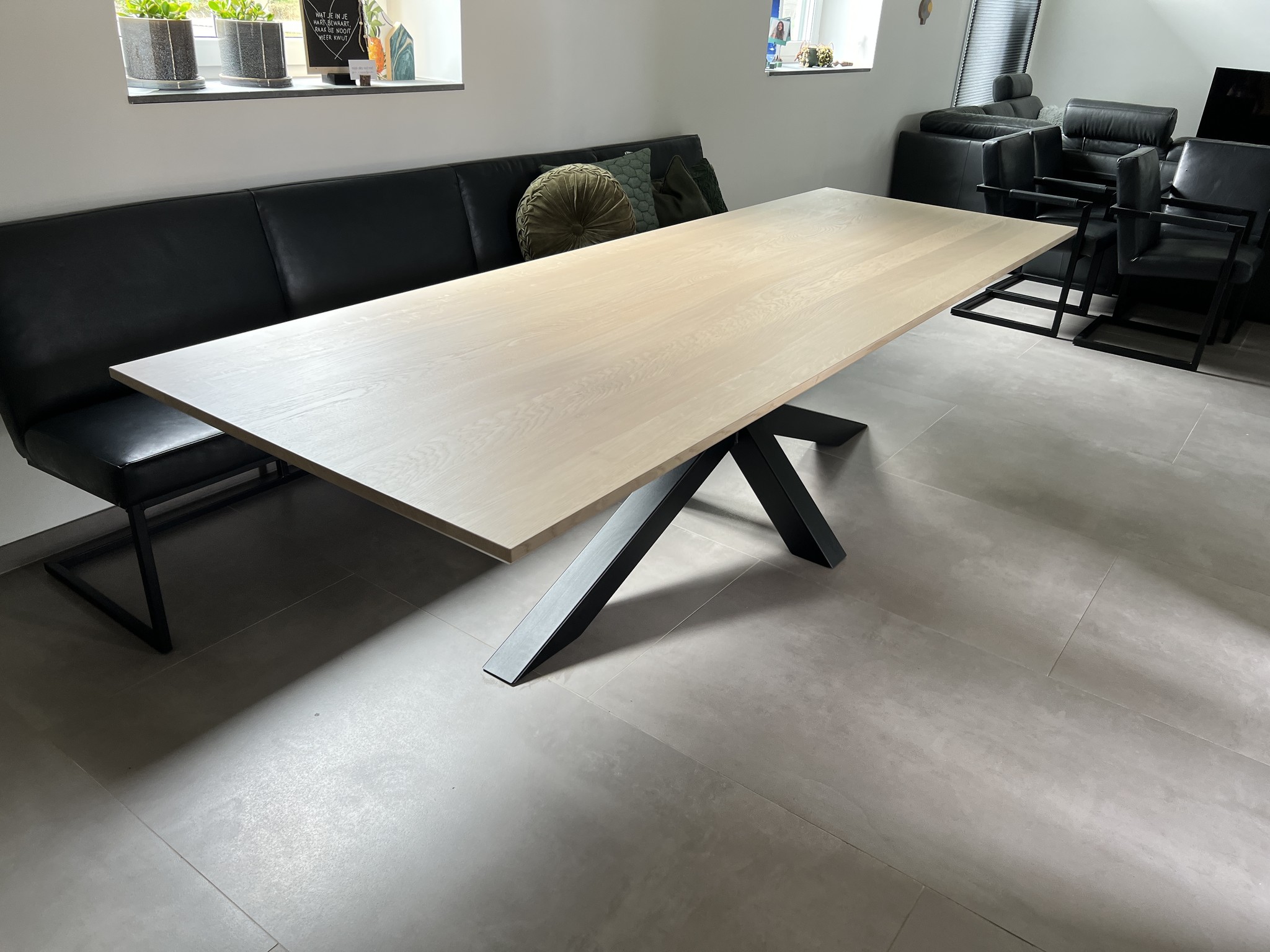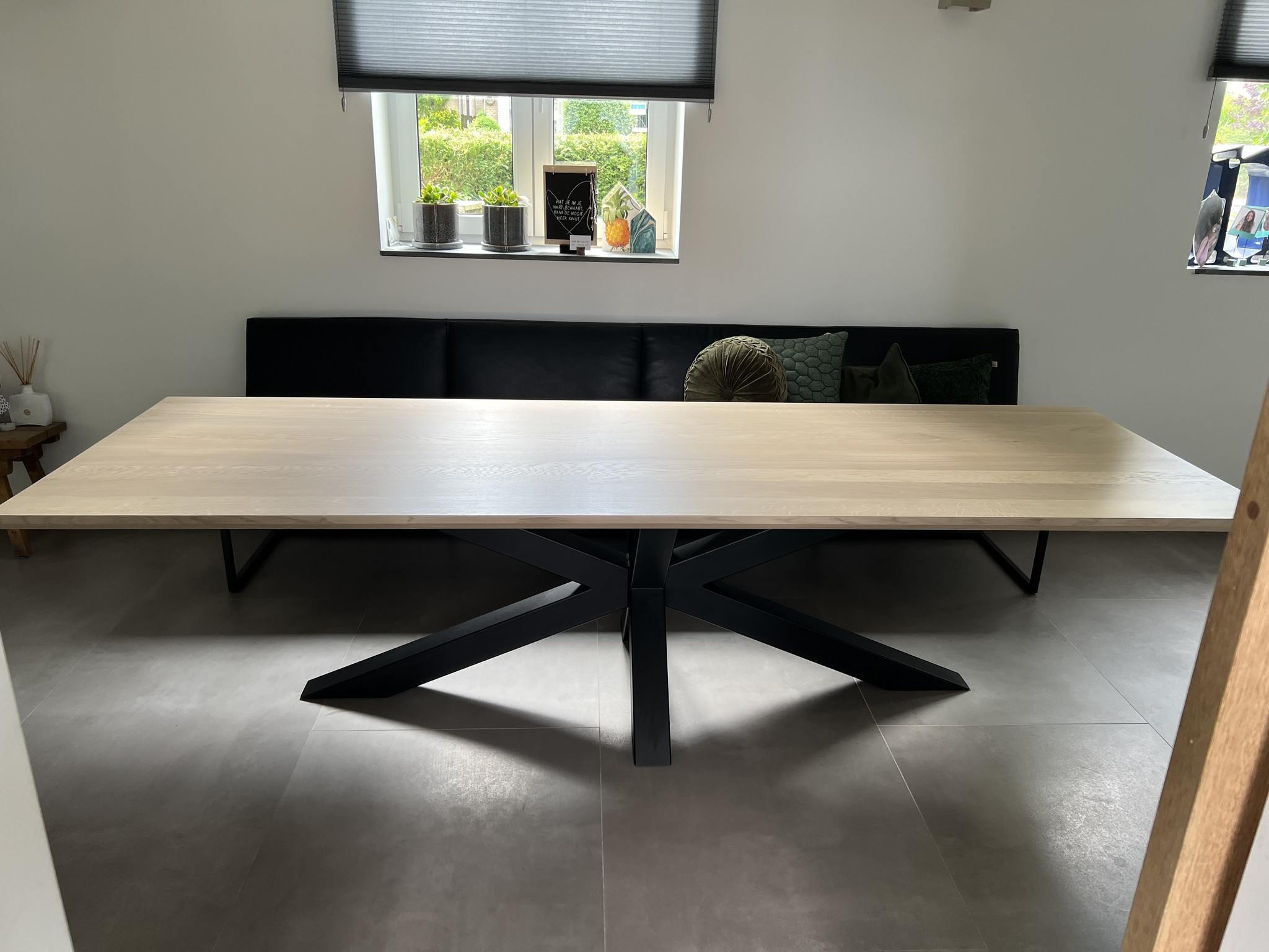 De eettafel Sofia straalt moderne elegantie uit met zijn rechthoekige, volmassieve blad van 4 cm dik in een frisse Nature White kleur. Het foutloos eiken met weinig tot geen noesten geeft de tafel een rustige, strakke uitstraling, terwijl het normale facet van de rand het ontwerp subtiel afrondt. Met een lengte van 300 cm en een breedte van 100 cm biedt deze tafel royaal plaats voor gezinsdiners of gezellige etentjes met vrienden. De zwarte spinpoten zorgen voor een stoere, eigentijdse touch en geven de tafel een stabiele basis.