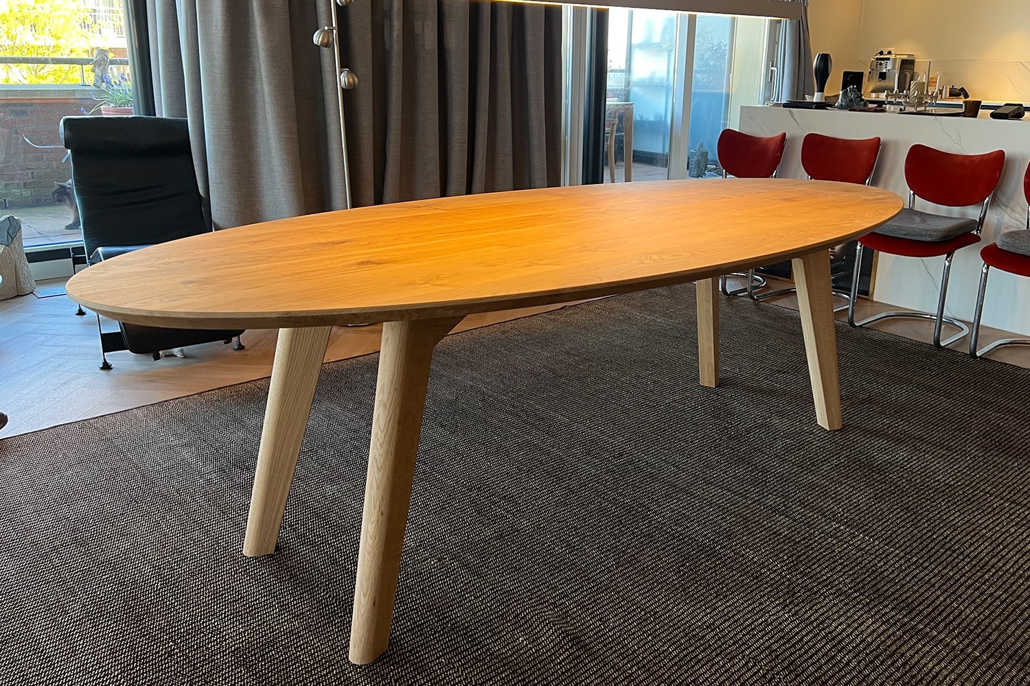 De Feyia ovale eettafel licht eiken brengt elegantie en warmte samen in een stijlvol ontwerp. Het blad is vervaardigd uit massief Frans eiken met noesten en heeft een transparant matte afwerking die de natuurlijke schoonheid van het hout prachtig benadrukt. Met een royale lengte van 250 cm en een breedte van 110 cm biedt de tafel volop ruimte voor gezellige diners of lange avonden met vrienden en familie. De groot facet rand en de schuine eiken poten geven het geheel een verfijnde en moderne uitstraling.