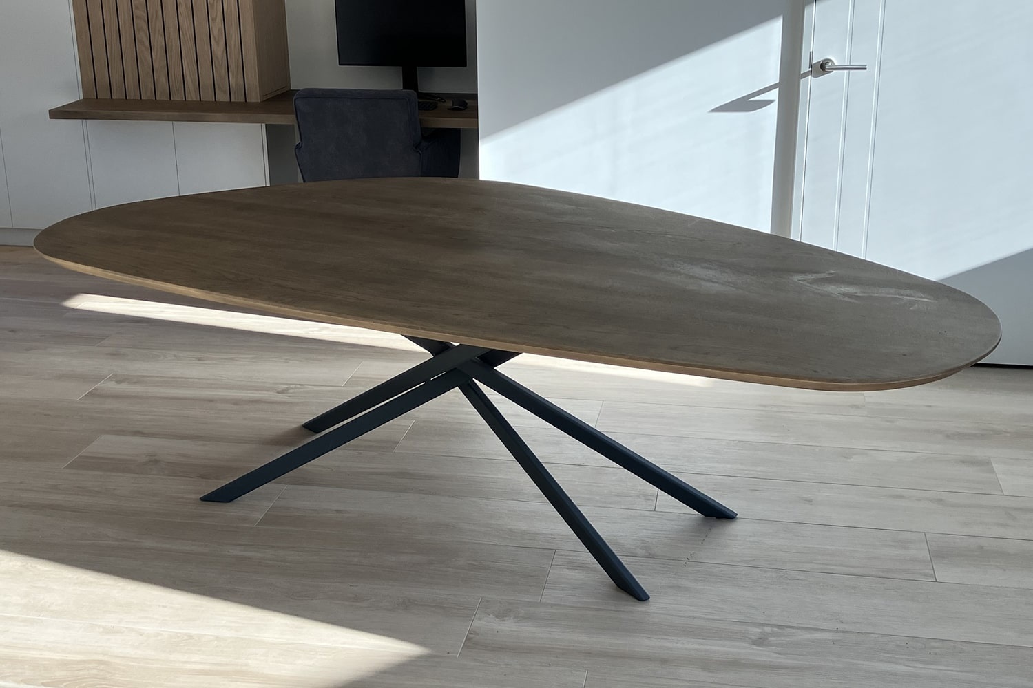 Eettafel Lavira valt direct op door zijn organische kiezelvorm en de diepe, warme Japandi-kleur van het blad. Gemaakt van foutloos Frans eiken, volmassief en met een dikte van 4 cm, straalt de tafel zowel kwaliteit als elegantie uit. De grote facetrand geeft het blad een subtiel karakter, terwijl de Mikado tafelpoot in antraciet RAL7021 een moderne, stoere touch toevoegt. Dit maakt Lavira een tijdloze blikvanger in zowel landelijke als eigentijdse interieurs.
