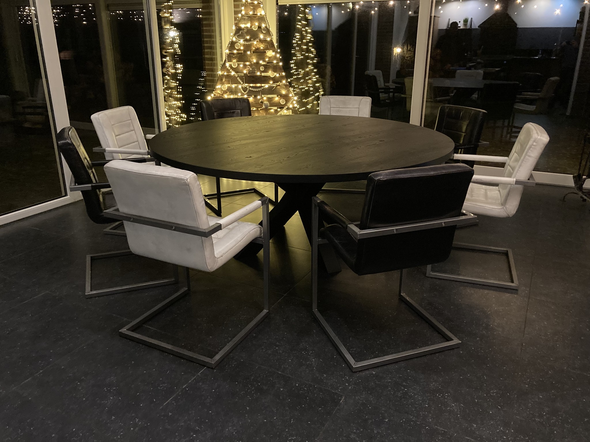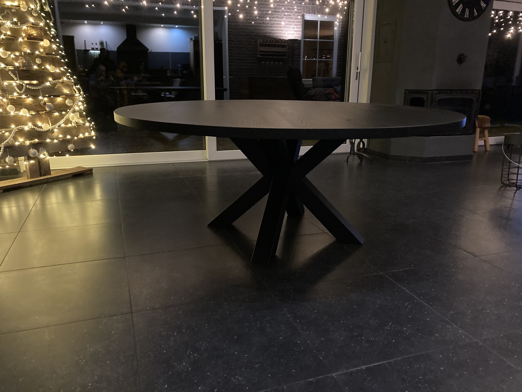 De Elarin ronde tafel straalt moderne elegantie uit met zijn 190 cm brede blad van normaal Frans eiken, voorzien van karakteristieke noesten. Het mat zwarte tafelblad met geborstelde afwerking geeft de ronde houten tafel een stoere, eigentijdse uitstraling die perfect past in een stijlvol interieur. Het 2 cm dikke blad en de 4 cm opgehoogde, rechte rand zorgen voor een robuust en verfijnd geheel. De zwarte spinpoot maakt het design compleet en biedt een speelse, maar stabiele ondersteuning.