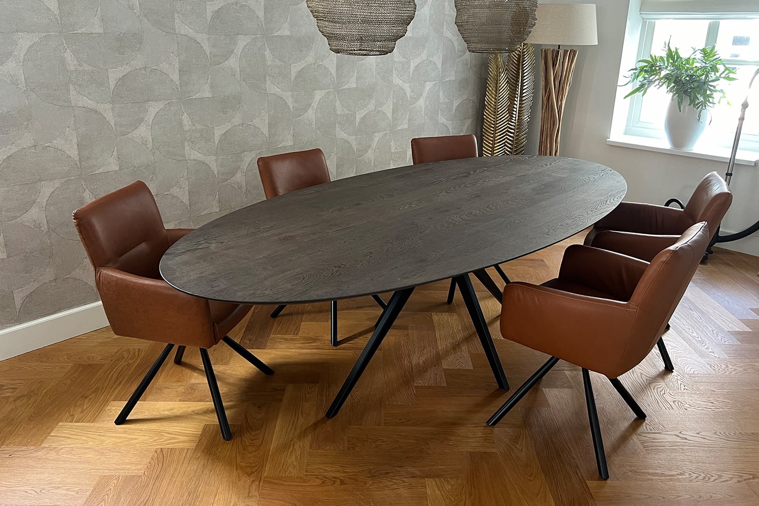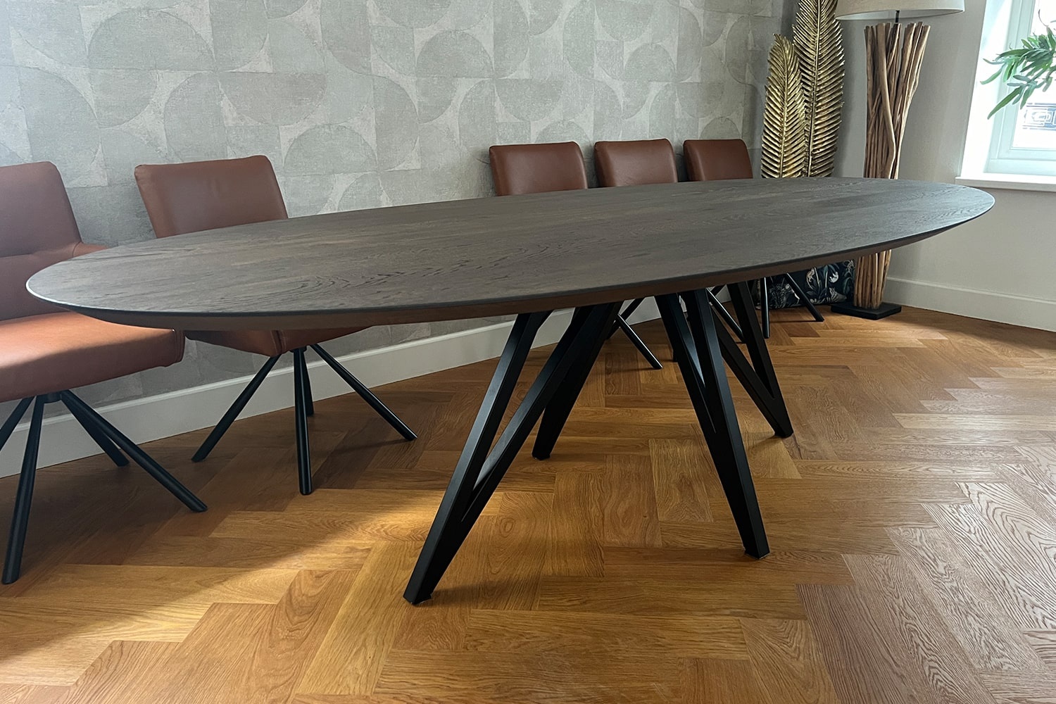 De elegante Hero tafel straalt luxe en verfijning uit dankzij het ovale tafelblad van Franse eik met natuurlijke noesten. Het Deer Brown blad, gecombineerd met het extra grote facet aan de rand en de geborstelde afwerking, geeft een warme en uitnodigende uitstraling. Met een lengte van 260 cm en een breedte van 120 cm biedt deze ovale tafel volop ruimte voor diners en gezellige samenkomsten. Het ontwerp balanceert robuust vakmanschap met een tijdloze elegantie.