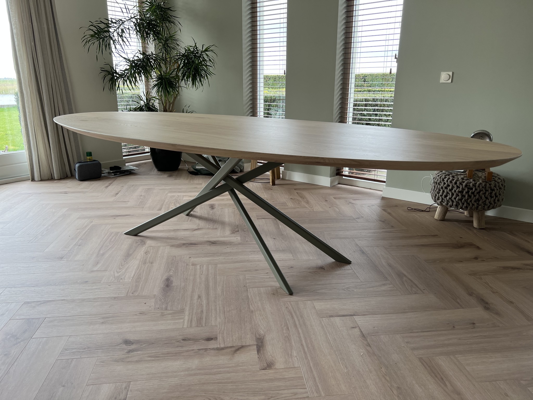 Deze Rimora ovale tafel combineert een eigentijdse uitstraling met een vleugje speelsheid. Het volmassieve Franse eiken, voorzien van natuurlijke noesten en afgewerkt in een zachte Nature White kleur, geeft het tafelblad een frisse en uitnodigende look. Het extra grote facet aan de tafelrand benadrukt de robuustheid, terwijl de ovale vorm zorgt voor een organisch en dynamisch karakter. Met een lengte van 300 cm en breedte van 130 cm biedt de tafel volop ruimte voor gezellige diners en sfeervolle bijeenkomsten.