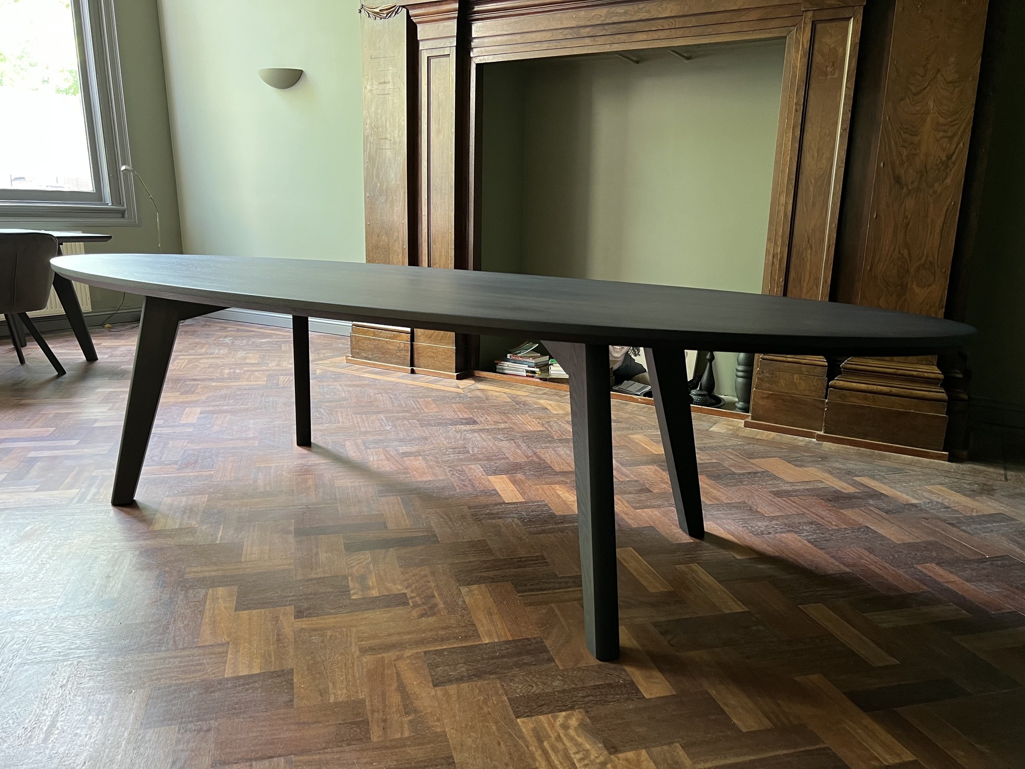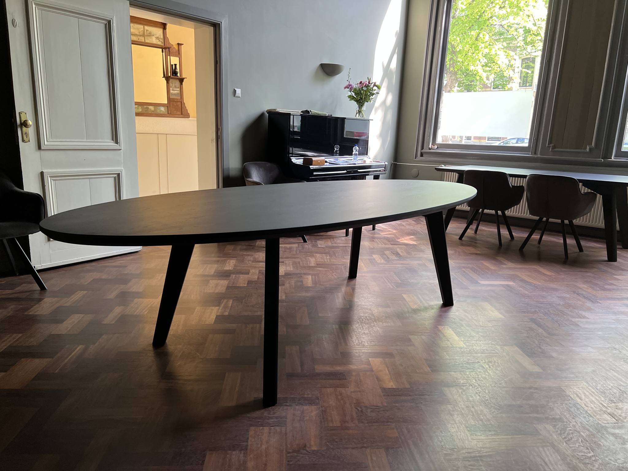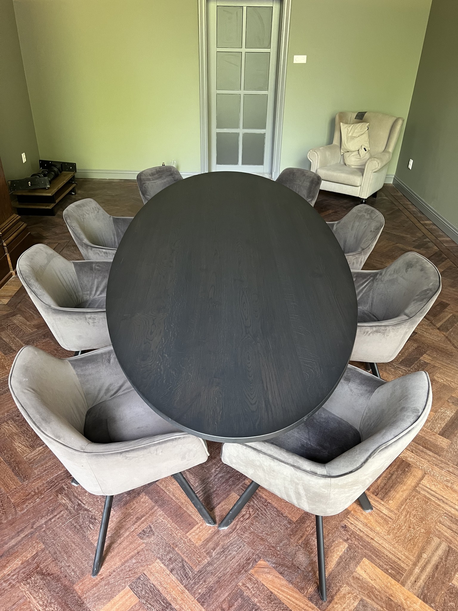 De Feyia elegante tafel ovaal is een royale eyecatcher die warmte en stijl samenbrengt. Het blad is gemaakt van massief Frans eiken met karaktervolle noesten en afgewerkt in een diepe Dark Oak kleur. Met zijn lengte van 300 cm en breedte van 120 cm biedt de tafel ruim plaats voor grote gezelschappen. De combinatie van het normale facet aan de rand en de schuine eiken poten zorgt voor een subtiel evenwicht tussen klassieke charme en eigentijds design.