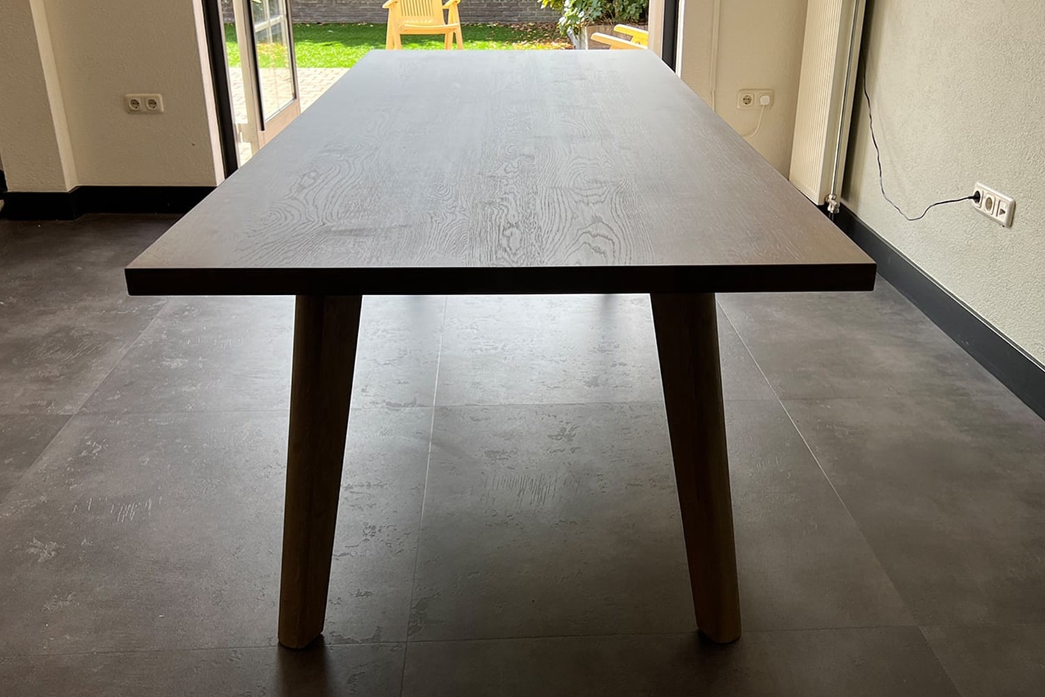 Kiest u voor deze optie, dan wordt uw tafel geborsteld. Eventuele opgevulde noesten zullen gedeeltelijk hun vulling verliezen als gevolg van het borsteleffect. Ons advies is om bij de kleur Zwart - mat te selecteren voor borstelen, zodat de kleur volledig tot zijn recht komt.