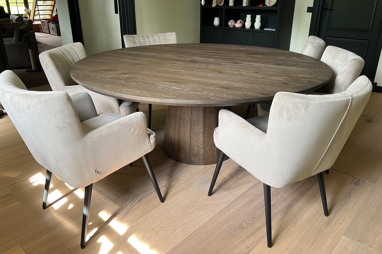 De Bruno straalt warmte en gezelligheid uit met zijn royale ronde blad van 190 cm, vervaardigd uit massief Frans eiken met FSC-keurmerk. Het volmassieve tafelblad van 4 cm dikte met een subtiel facet benadrukt de kracht van puur hout, terwijl de noesten zorgen voor een levendig en natuurlijk karakter. Dankzij de Deer Brown afwerking en het geborstelde oppervlak krijgt de ronde houten eettafel een sfeervolle uitstraling die perfect past in een modern of landelijk interieur. De ronde eiken O-poot voegt stabiliteit en elegantie toe aan het geheel.