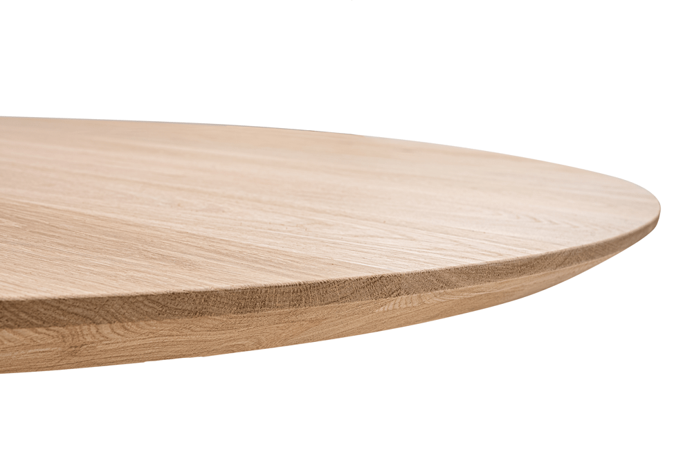 De Kareo is een prachtige ronde eettafel die direct een warme en natuurlijke sfeer in je interieur brengt. Het foutloze Franse eikenblad met een diameter van 140 cm heeft een heldere SKYLT-afwerking die de natuurlijke houtkleur accentueert. De opgehoogde rand van 4 cm met groot facet geeft het blad een subtiel elegant detail, terwijl de 2 cm dikke tafelblad een lichte en verfijnde uitstraling behoudt. De eiken spinpoot completeert het design en zorgt voor een tijdloze, stijlvolle basis.
