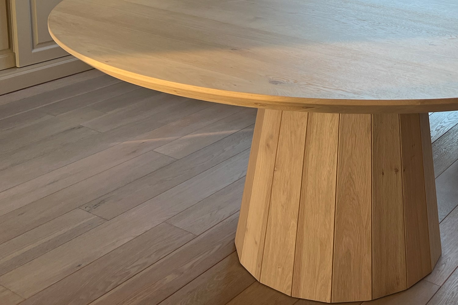 De Bruno is een stijlvolle ronde houten eettafel met een diameter van 160 cm, gemaakt van foutloos Frans eiken met FSC-keurmerk. Het tafelblad van 2 cm is opgedikt tot 4 cm en voorzien van een groot facet, wat de tafel een elegante en verfijnde uitstraling geeft. Dankzij de SKYLT-afwerking behoudt het hout zijn natuurlijke, lichte kleur en voel je de puurheid van het materiaal. De ronde eiken O-poot vormt een subtiel maar stevig fundament dat het ontwerp compleet maakt.