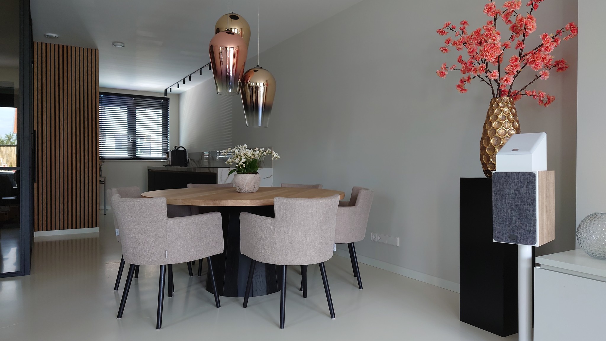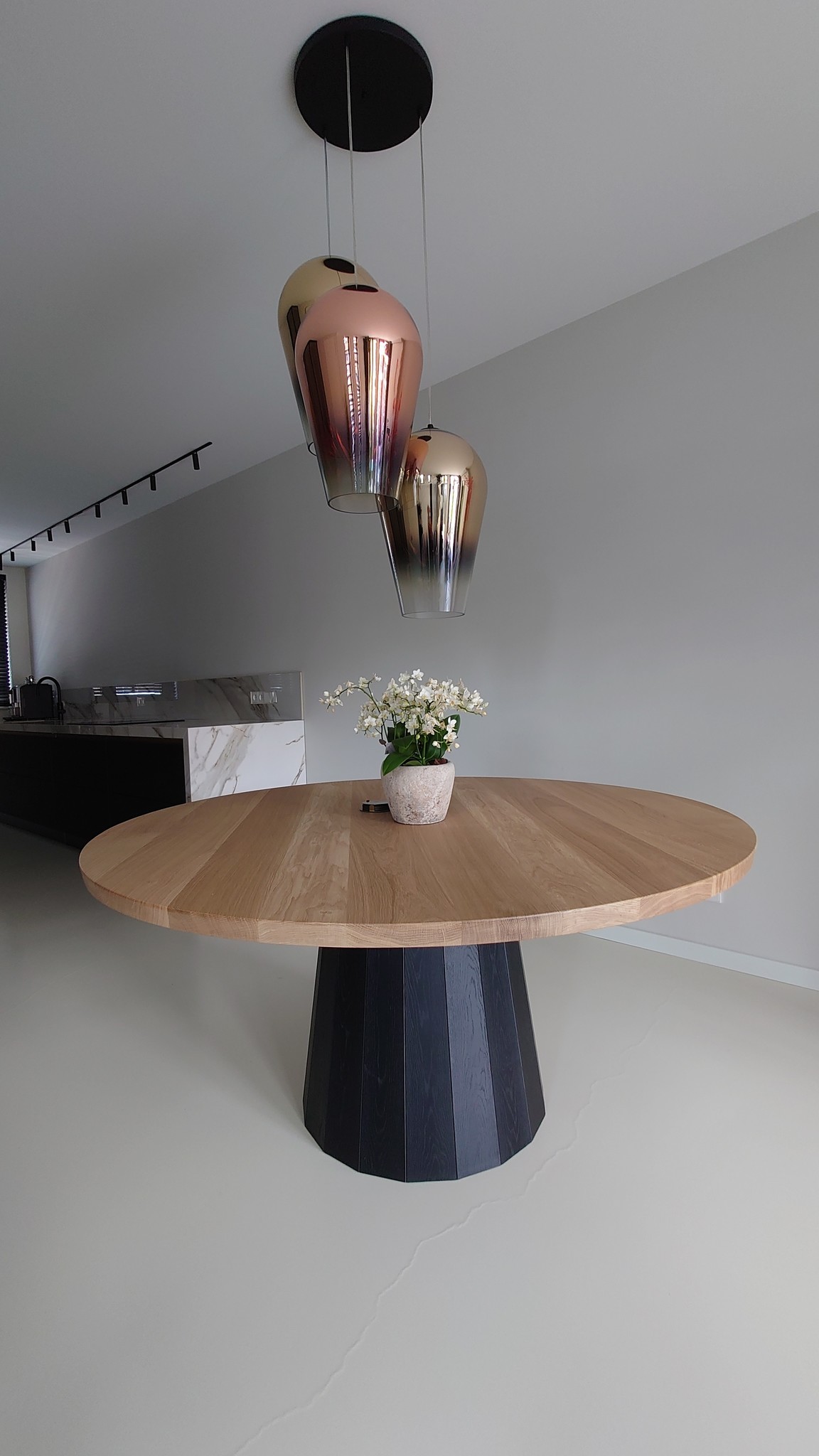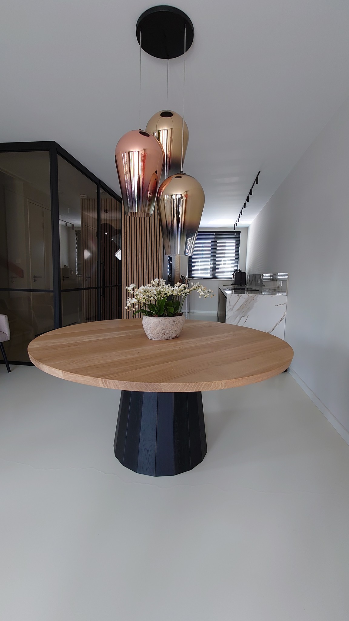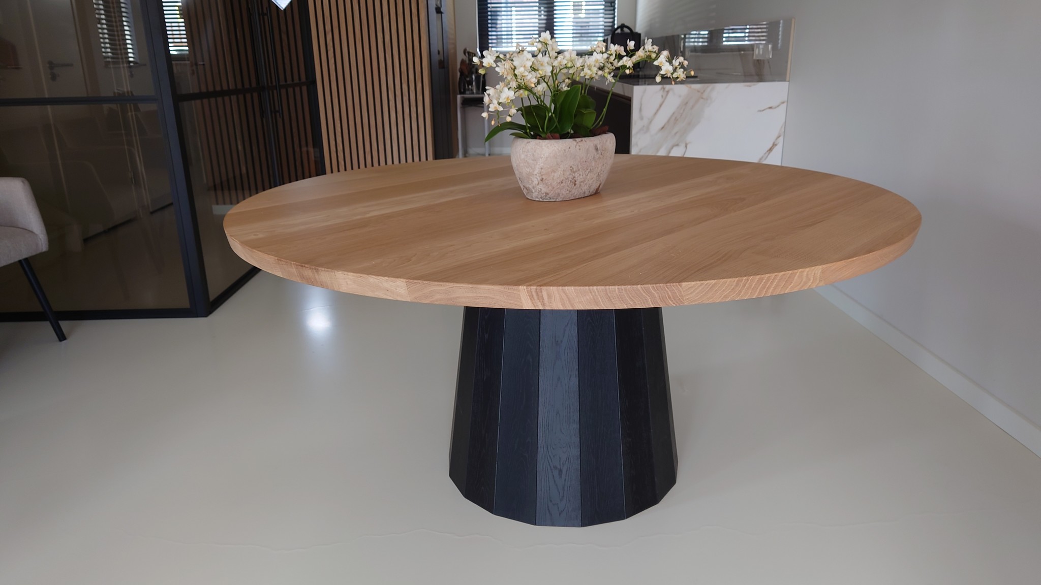 De Bruno is een moderne ronde houten eettafel die een combinatie van strak design en natuurlijk vakmanschap uitstraalt. Het volmassieve Frans eiken blad met een diameter van 160 cm is foutloos en subtiel afgewerkt, waardoor de tafel een rustige en elegante uitstraling krijgt. De schuine rand van 70 graden en de mat transparante afwerking versterken het eigentijdse karakter, terwijl de zwarte, geborstelde O-poten een stoere touch toevoegen. Dankzij deze mix van details past de Bruno perfect in een modern interieur met warme accenten.