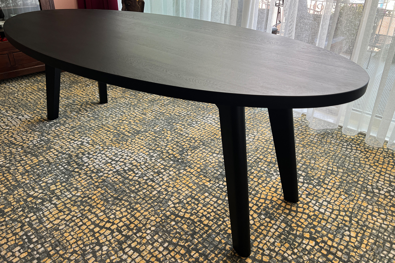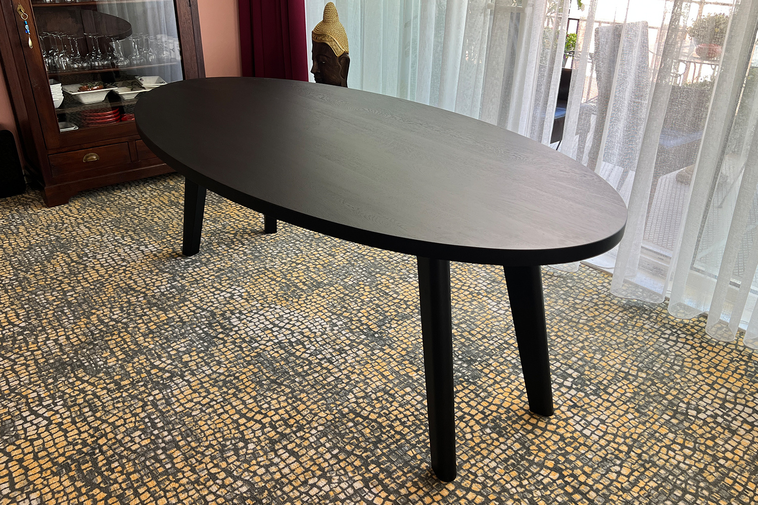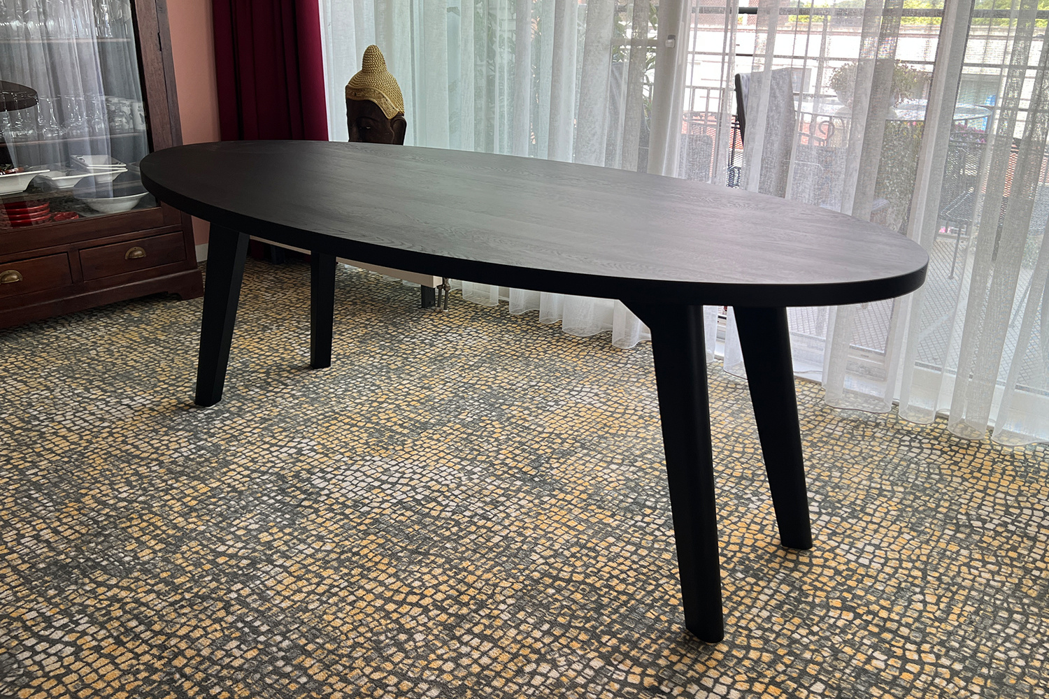 De Feyia eettafel straalt pure elegantie uit met haar ovale vorm en massief eiken blad van 4 cm dik. Het normale eikenhout met subtiele noesten geeft de tafel een natuurlijke charme, terwijl de matte zwarte afwerking voor een moderne en stijlvolle uitstraling zorgt. Met een lengte van 220 cm en een breedte van 110 cm biedt deze tafel volop ruimte om samen te genieten van diners en gezellige momenten. De schuine eiken poten maken het ontwerp compleet en zorgen voor een verfijnd maar stevig karakter.