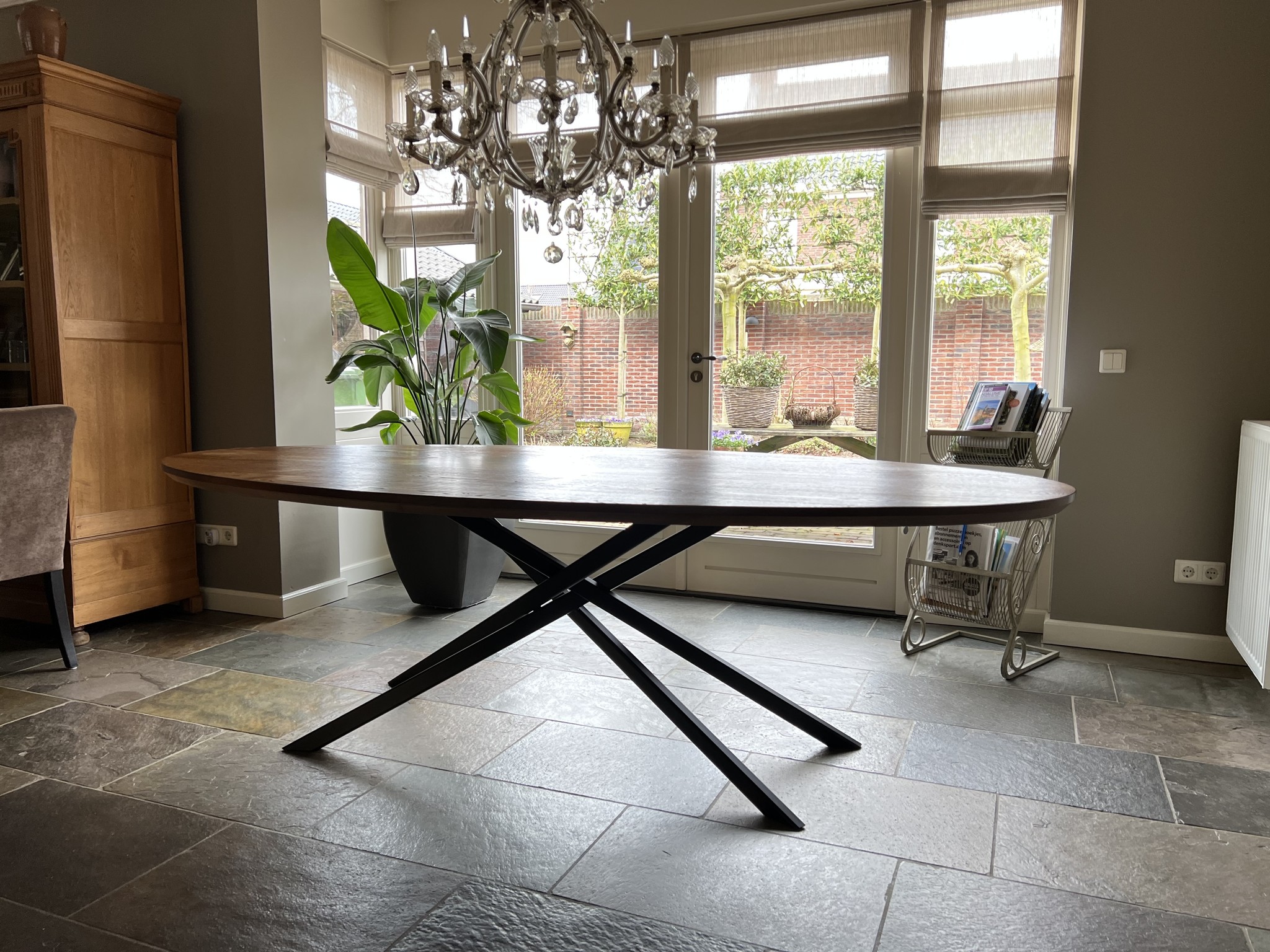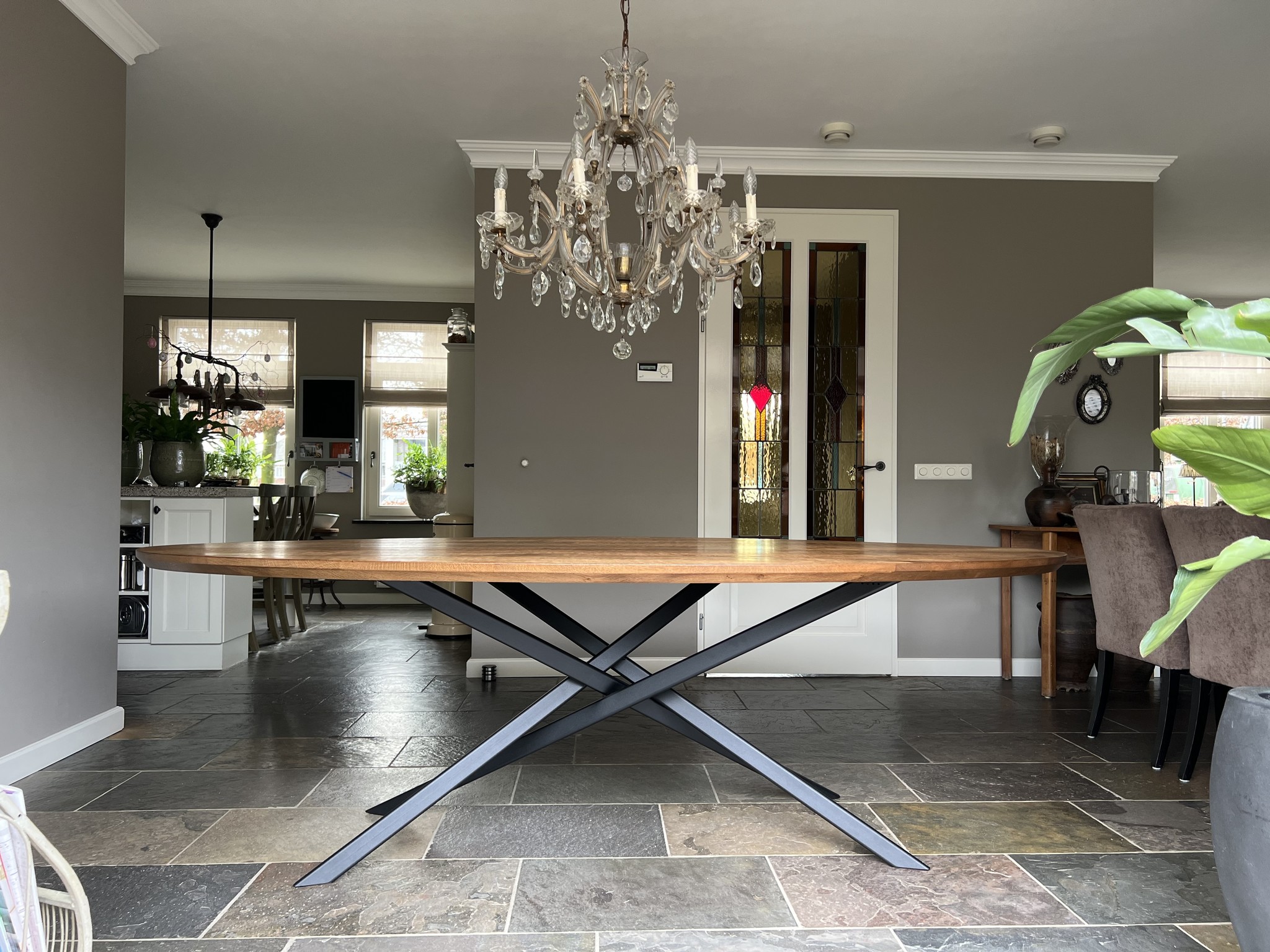 De Rimora elegante ovale tafel combineert een verfijnde uitstraling met natuurlijke charme. Het ovale tafelblad van Franse eik, met zichtbare noesten en een subtiel normaal facet, straalt warmte en karakter uit. De geborstelde afwerking benadrukt het unieke houtpatroon, terwijl de zwarte Mikado-poot een modern contrast toevoegt. Met een royale lengte van 240 cm en een breedte van 130 cm biedt deze tafel volop ruimte voor sfeervolle diners en gezellige momenten.