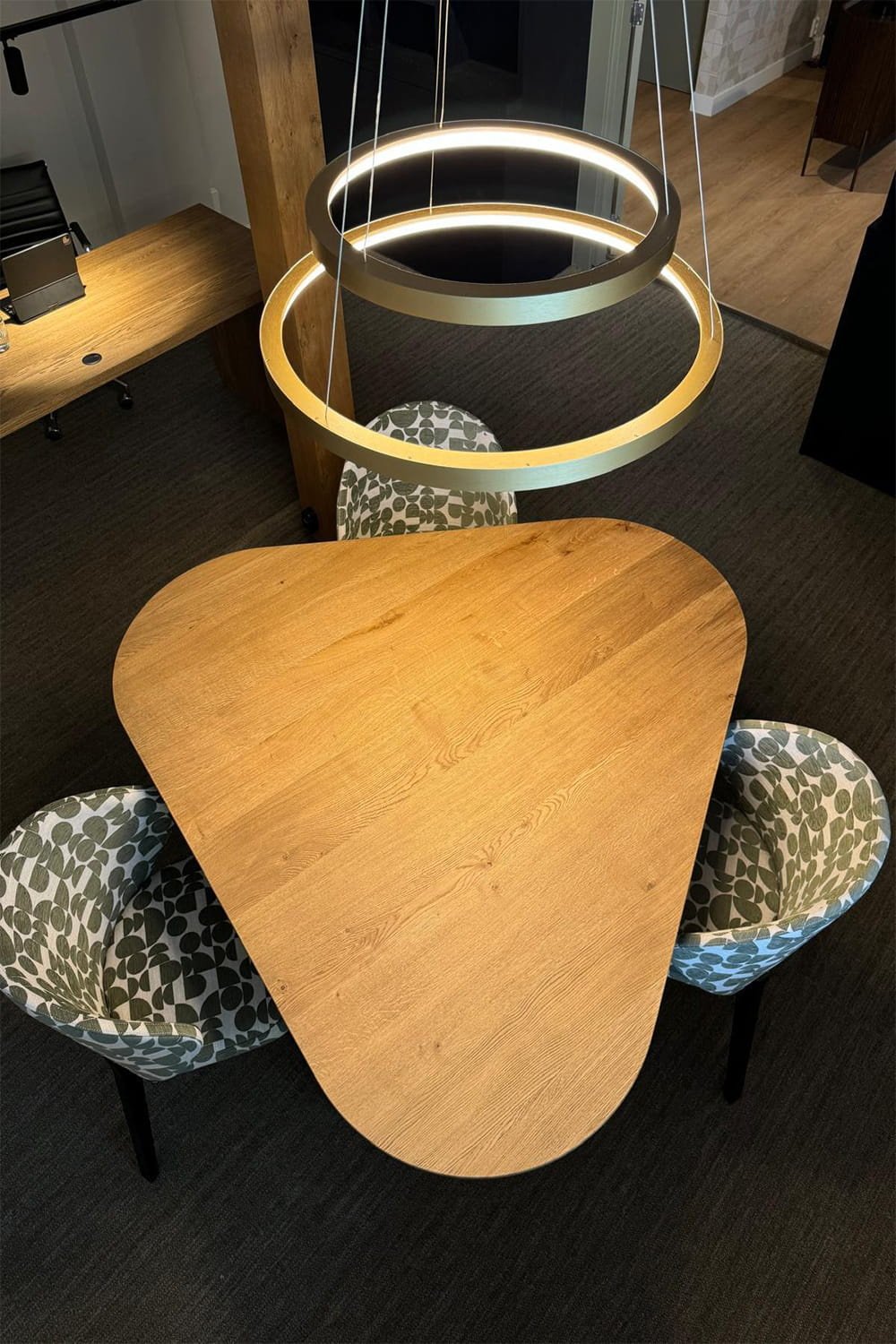 Vergadertafel Alwin heeft een unieke en speelse uitstraling dankzij de driehoekige vorm, die zorgt voor een dynamische en betrokken manier van vergaderen. Het volmassieve blad van 4 cm dik is gemaakt van Frans eiken met natuurlijke noesten en afgewerkt in een warme antieke tint, wat de tafel karakter en diepte geeft. Met een diameter van 160 cm en een extra groot facet aan de rand oogt de tafel robuust en verfijnd tegelijk, ondersteund door een ronde eiken O-poot. Bij al onze vergadertafels is randapparatuur niet standaard inbegrepen, maar kan deze indien gewenst tegen meerprijs geïntegreerd worden.