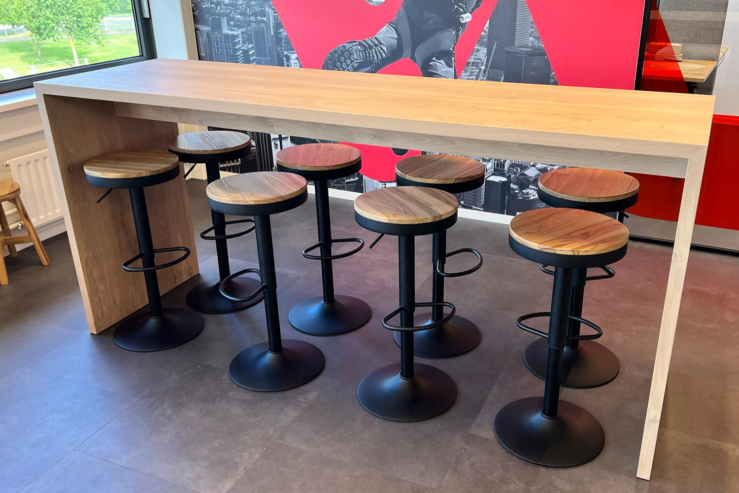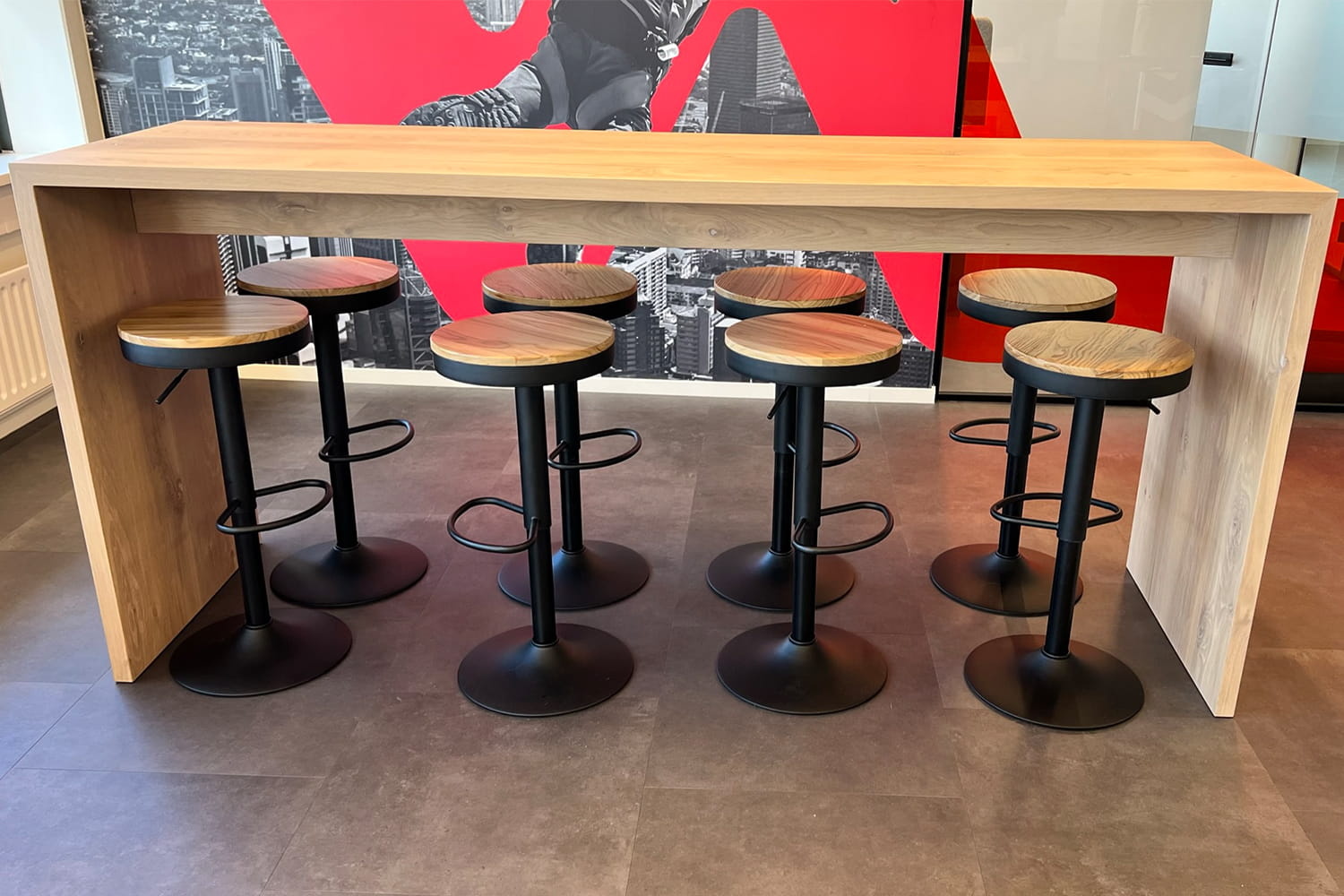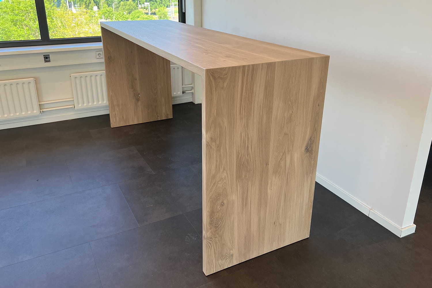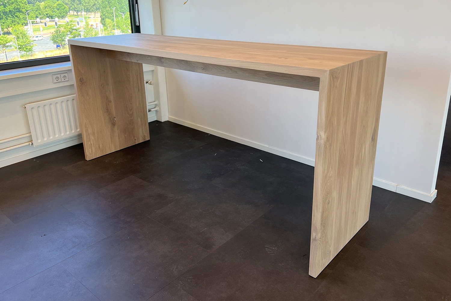 Vergadertafel Devin is een prachtige bartafel, uitgevoerd in licht Frans eiken. Met het doorlopende tafelblad is dit een stijlvolle aanvulling in elke kantoorruimte. Onze tafels zijn maatwerk, en daarom volledig naar eigen wens samen te stellen!