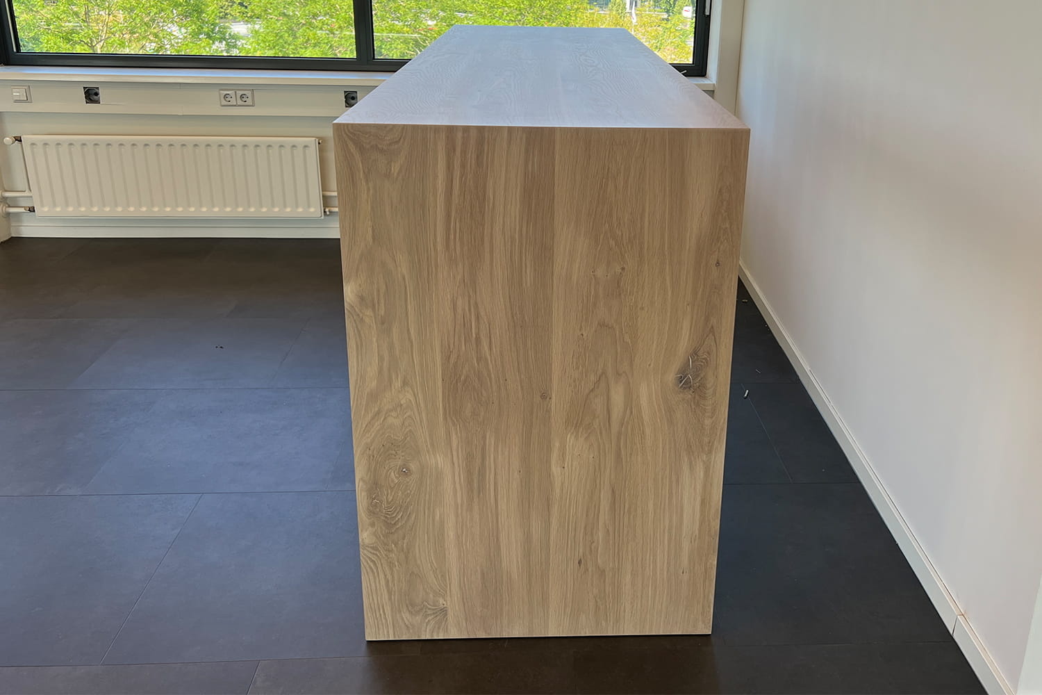 Vergadertafel Devin valt op door zijn strakke, moderne uitstraling met een rechthoekig blad van massief Frans eiken in een lichte Nature White afwerking. Het 4 cm dikke blad met subtiele noesten geeft de tafel een natuurlijke uitstraling, terwijl het verstekdesign zorgt voor een minimalistisch en krachtig geheel dat doorloopt tot aan de grond. Met een lengte van 240 cm en een hoogte van 110 cm is dit een ideale statafel voor dynamische overleggen en korte meetings. Om het verstek te versterken loopt er onder het blad een balk van circa 15 cm hoog over de volledige lengte, die niet alleen het design accentueert maar ook extra ondersteuning biedt aan de tafel.