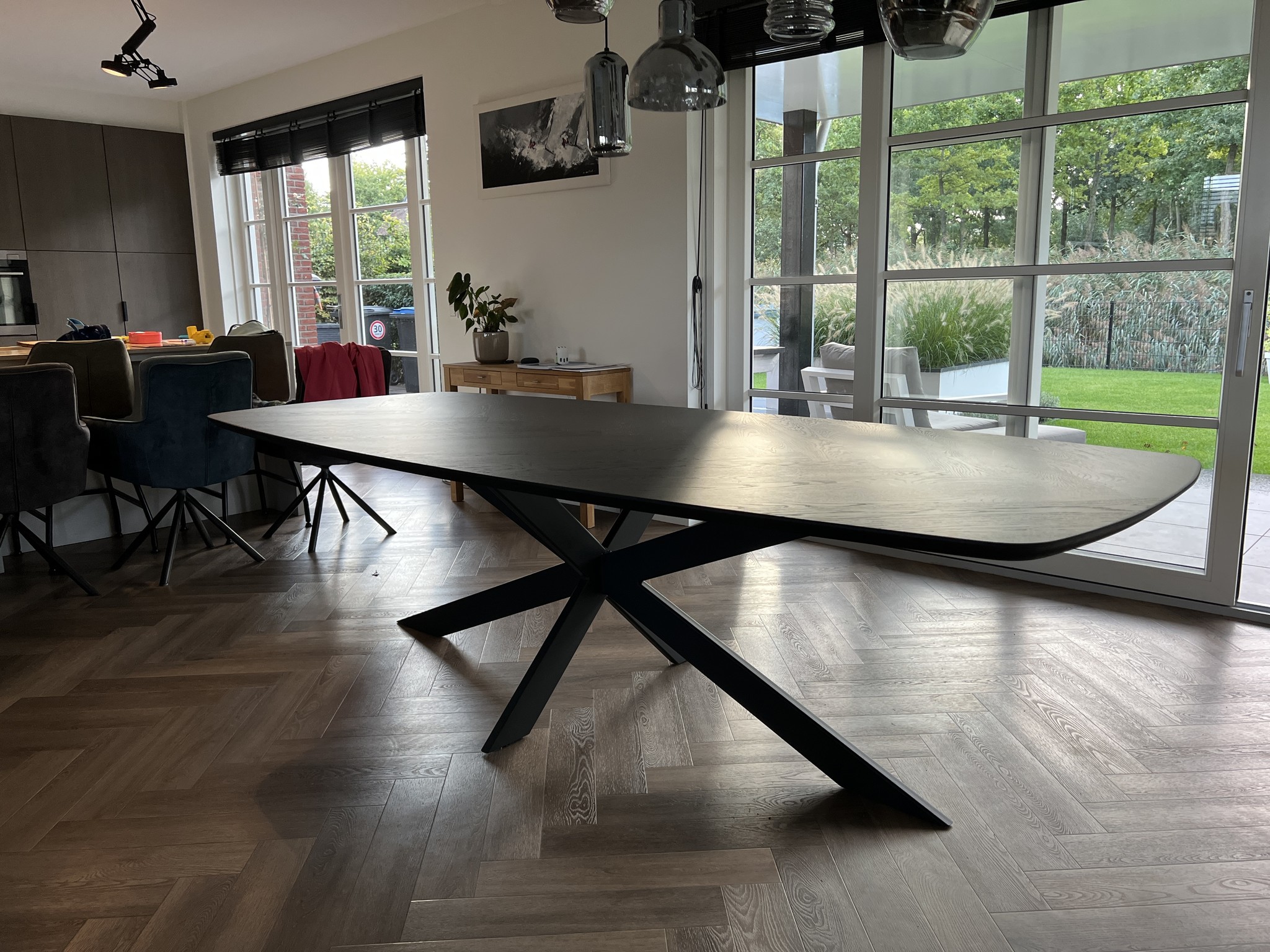 De Linel verfijnde visgraat eettafel straalt elegantie en tijdloos design uit met een Deens ovaal blad van Frans eiken, afgewerkt in de diepe Dark Oak kleur. Het visgraatmotief op het 33 mm dikke blad voegt een luxe touch toe, terwijl de zwarte MDF onderkant zorgt voor een strak contrast. Met een lengte van 280 cm en een breedte van 120 cm biedt deze Scandinavische tafel volop ruimte voor gezellige diners of zakelijke bijeenkomsten. De spinpoot met platte koker XL geeft de tafel een stabiele en moderne basis.