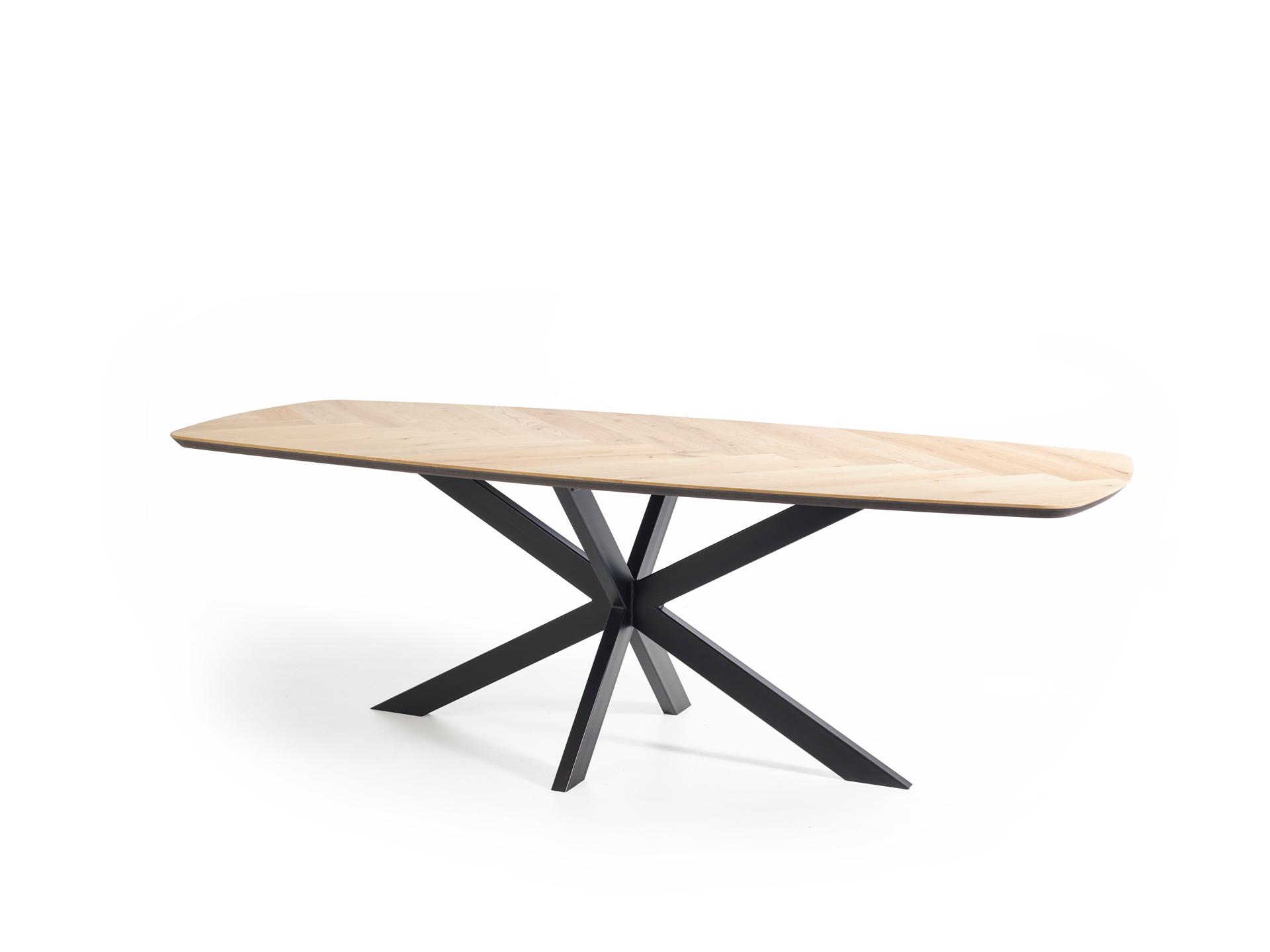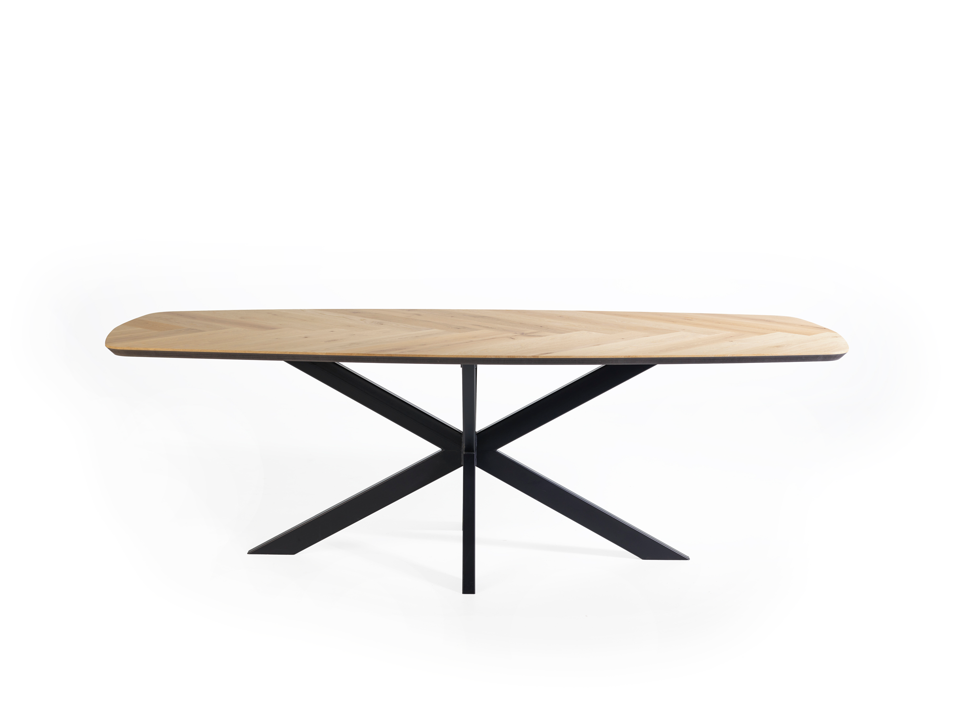 De Navin Deens ovale visgraat tafel combineert tijdloze elegantie met een natuurlijke uitstraling dankzij het warme SKYLT-eikenhout. Het 33 mm dikke blad met visgraatmotief ligt op een stevig zwart MDF onderstel, wat zorgt voor een strak en modern contrast. Met een lengte van 220 cm en een breedte van 100 cm biedt deze tafel voldoende ruimte voor gezellig samenzijn. De zwarte spinpoot met platte koker geeft de tafel een eigentijdse, stabiele basis die perfect aansluit bij diverse interieurstijlen.