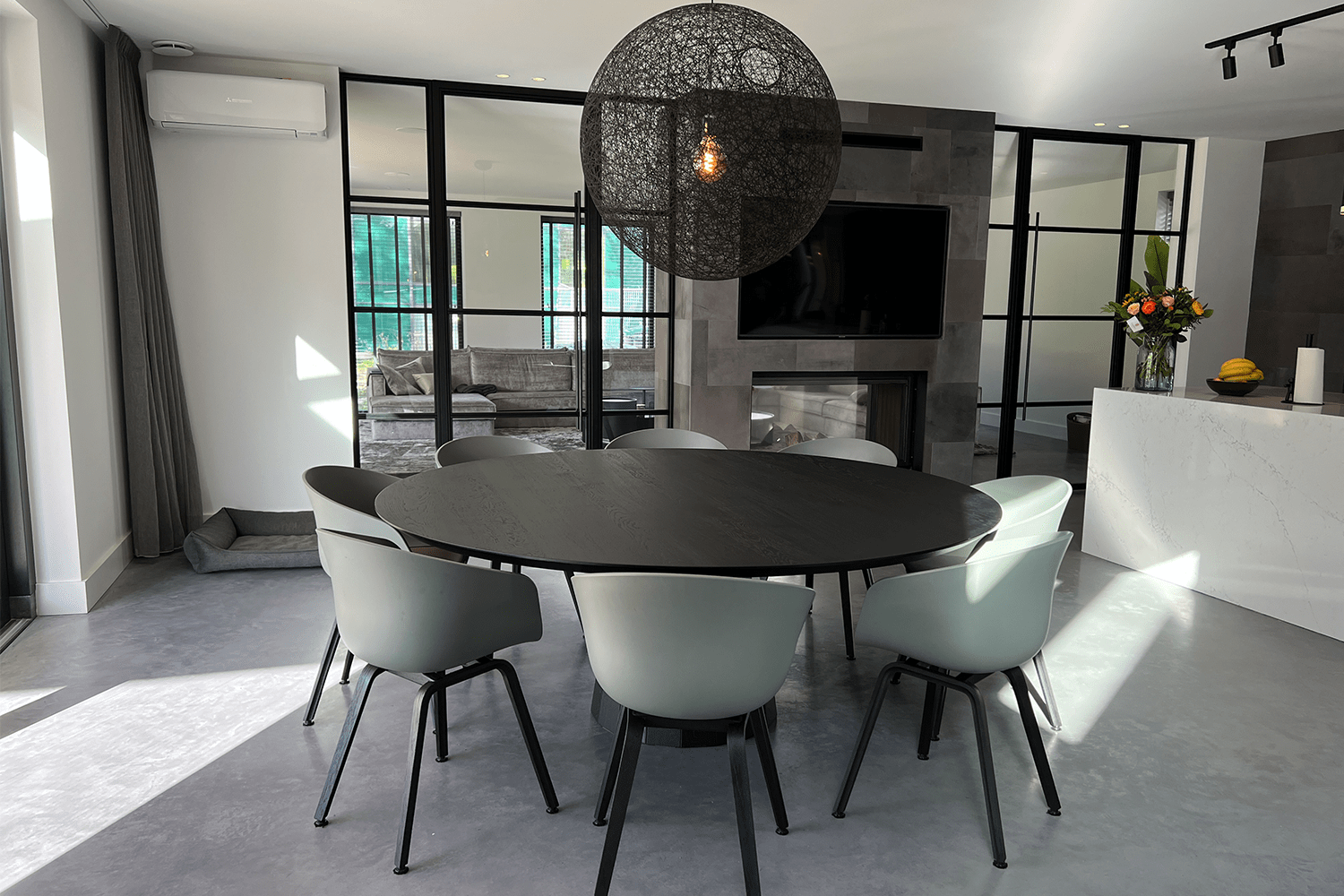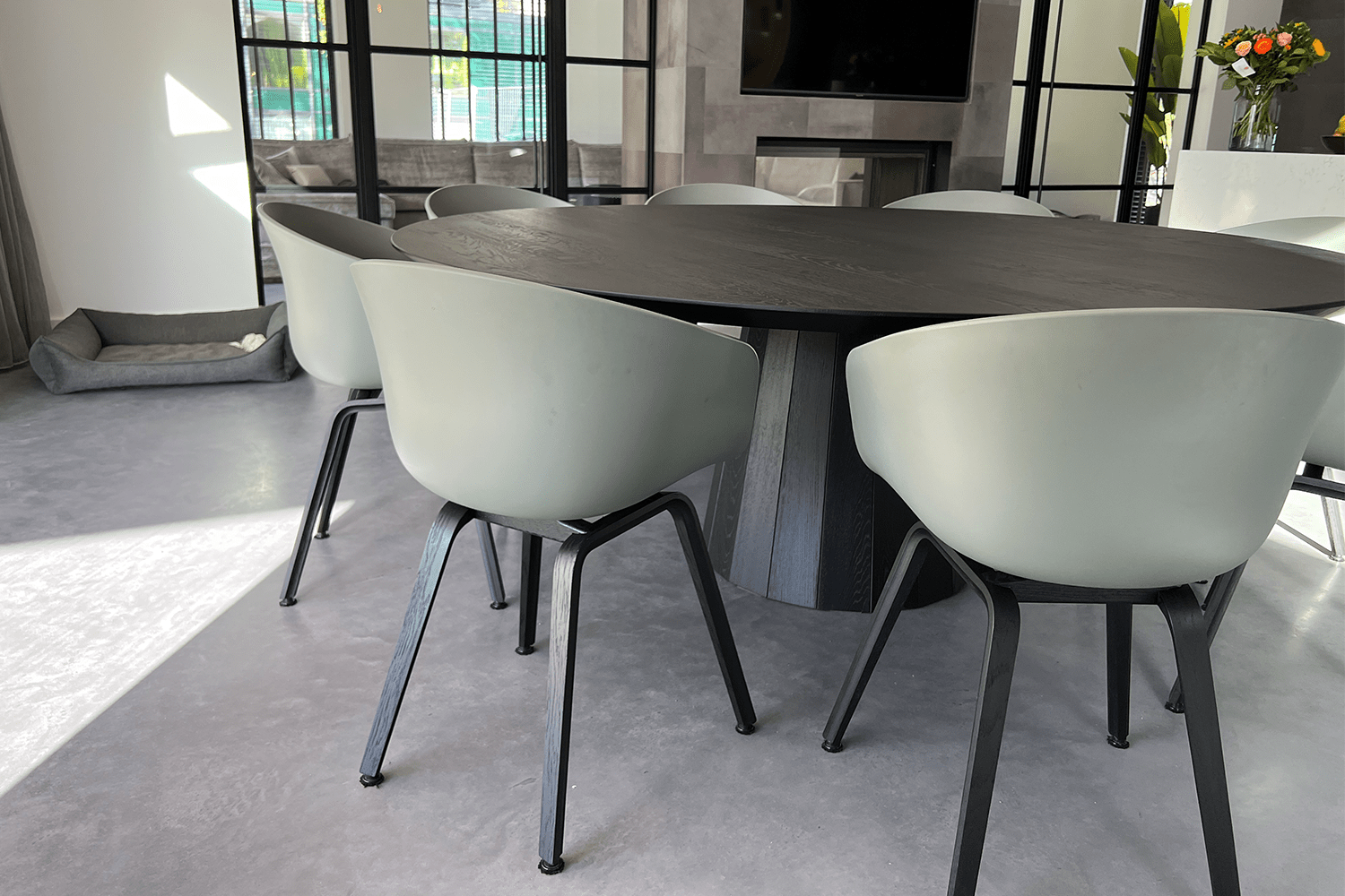 De Bruno is een imposante ronde eettafel van 200 cm doorsnede, uitgevoerd in hoogwaardig Frans eiken met FSC-keurmerk. Het volmassieve tafelblad van 4 cm dikte is voorzien van een extra groot facet, wat de tafel een robuuste maar verfijnde uitstraling geeft. De zwarte matte afwerking in combinatie met het geborstelde oppervlak benadrukt de natuurlijke structuur van het hout en zorgt voor een stoere, eigentijdse look. De ronde eiken O-poot maakt het geheel stabiel en stijlvol.